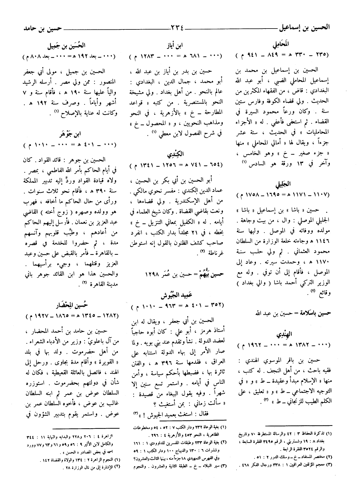 الحسين بن إسماعيل بن محمد بن إسماعيل المحاملي الضبي، أبو عبد الله البغدادي: قاض، من الفقهاء المكثرين من الحديث. ولي قضاء الكوفة وفارس ستين سنة. وكان ورعا محمود السيرة في القضاء. ثم استعفى فأعفي. له (الأجزاء المحامليات) في الحديث، ستة عشر جزءا ويقال لها (أمالي المحاملي) منها (جزء صغير - خ) وهو الخامس، وآخر في 13 ورقة هو السادس (1) ،