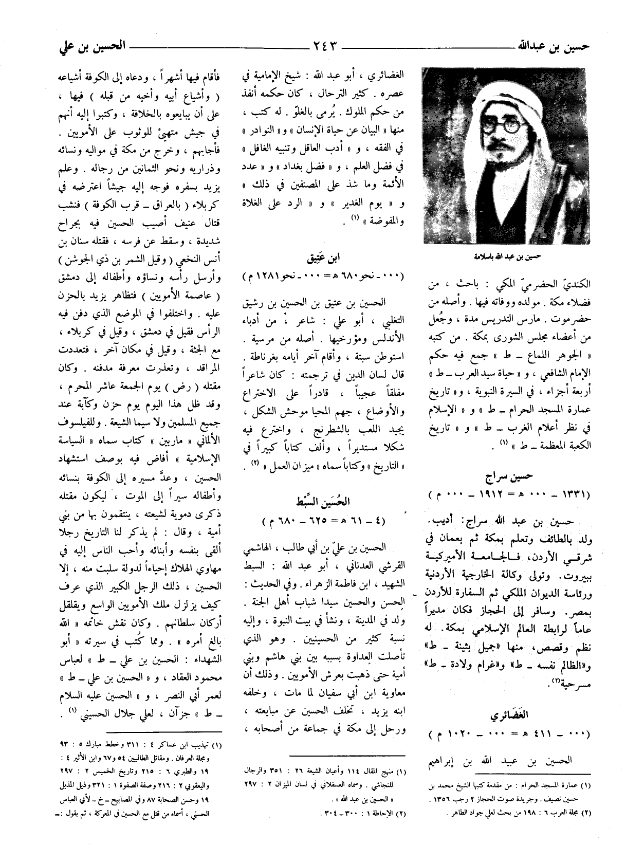 حسين بن عبد الله سراج: أديب. ولد بالطائف وتعلم بمكة ثم بعمان في شرقي الأردن، فالجامعة الأميركية ببيروت. وتولى وكالة الخارجية الأردنية ورئاسة الديوان الملكي ثم السفارة للأردن بمصر. وسافر إلى الحجاز فكان مديرا عاما لرابطة العالم الإسلامي بمكة إلى أن توفي. له نظم