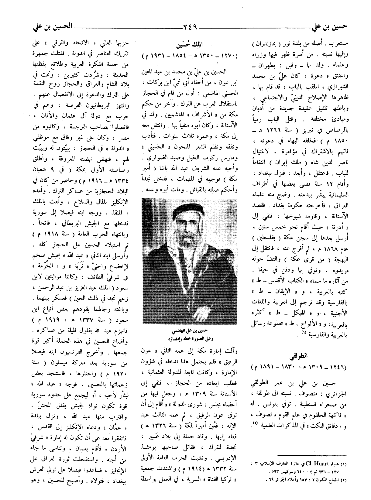 حزبها العلني (الاتحاد والترقي) على تتريك العناصر في الدولة. فقتلت جمهرة من حملة الفكرة العربية وطلائع يقظتها الحديثة، وشرّدت كثيرين، ونمت في بلاد الشام والعراق والحجاز روح النقمة على الترك والدعوة إلى الانفصال عنهم. وانتهز البريطانيون الفرصة، وهم في حرب مع دولة آل عثمان والألمان، فاتصلوا بصاحب الترجمة، وكاتبوه من مصر، وكان على غير وفاق مع موظفي (الدولة) في الحجاز، يبيّتون له ويبيّت لهم، فنهض نهضته المعروفة، وأطلق رصاصته الأولى بمكة (في 9 شعبان 1334 - 1916 م) وحاصر من كان في البلاد الحجازية من عساكر الترك. وأمده الإنكليز بالمال والسلاح، ونعت بالملك (المنقذ) ووجه ابنه فيصلا إلى سورية فدخلها مع الجيش البريطاني، فاتحا. وبانتهاء الحرب العامة (سنة 1918 م) تم استيلاء الحسين على الحجاز كله. وأرسل ابنه الثاني (عبد الله) بجيش ضخم لإخضاع واحتي (تَرَبَة) و (الخُرْمة) في شرقيّ الطائف، وكانتا مواليتين لابن سعود (الملك عبد العزيز بن عبد الرحمن، زعيم نجد في ذلك الحين) فعسكر بينهما. وباغته رجالهما يقودهم بعض أتباع ابن سعود (سنة 1337 هـ 1919 م) فانهزم عبد الله بفلول قليلة من عساكره. وأضاع الحسين في هذه الحملة أكبر قوة جمعها. وأخرج الفرنسيون ابنه فيصلا من سورية بعد معركة ميسلون