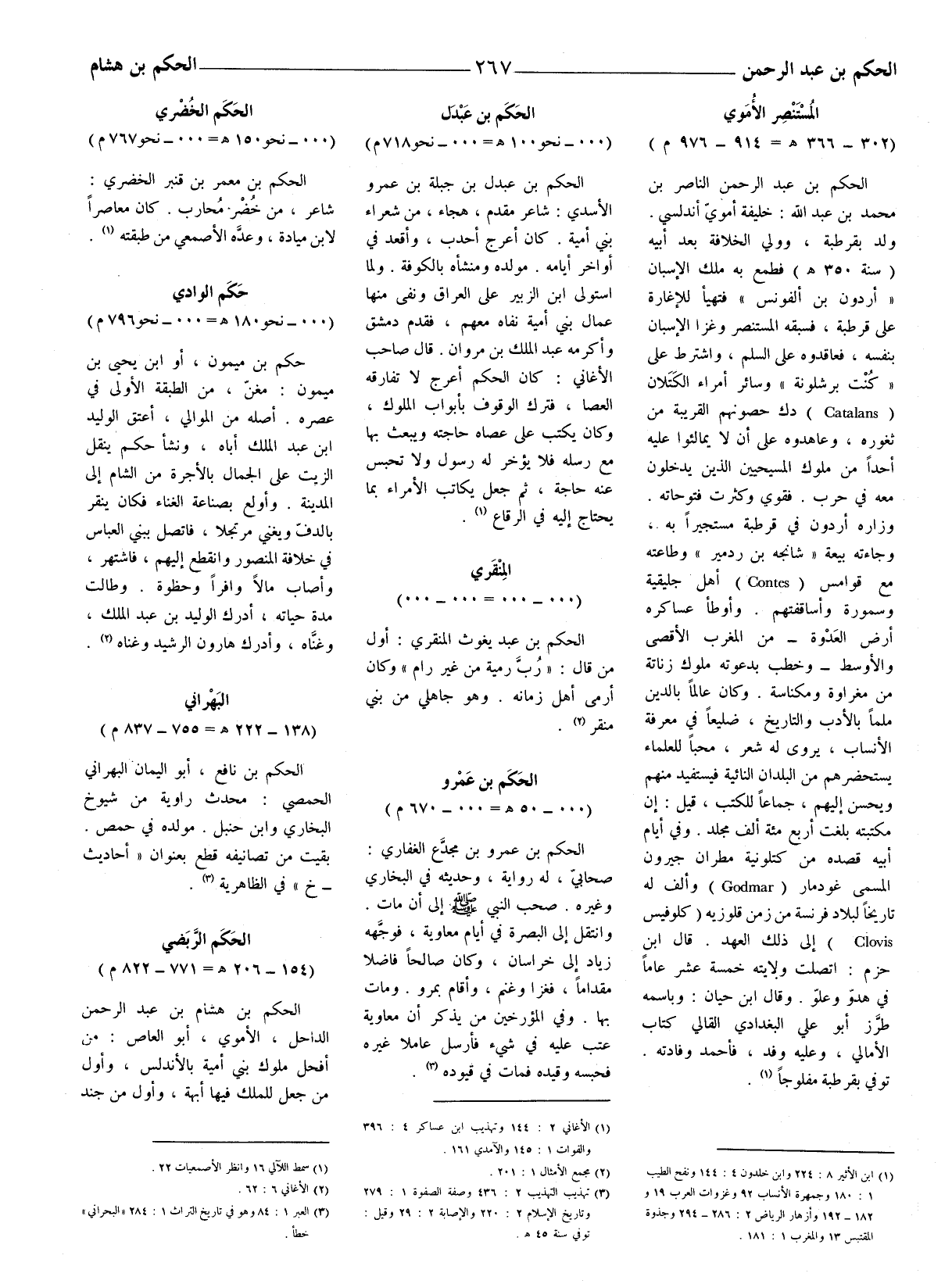 الحكم بن عبد الرحمن الناصر بن محمد بن عبد الله: خليفة أمويّ أندلسي. ولد بقرطبة، وولي الخلافة بعد أبيه (سنة 350 هـ فطمع به ملك الإسبان (أر دون بن ألفونس) فتهيأ للإغارة على قرطبة، فسبقه المستنصر وغزا الإسبان بنفسه، فعاقدوه على السلم، واشترط على (كُنْت برشلونة) وسائر أمراء الكَتلان (Catalans) دك حصونهم القريبة من ثغوره، وعاهدوه على أن لا يمالئوا عليه أحدا من ملوك المسيحيين الذين يدخلون معه في حرب. فقوي وكثرت فتوحاته. وزاره أر دون في قرطبة مستجيرا به، وجاءته بيعة (شانجه بن ردمير) وطاعته مع قوامس ((Contes أهل جليقية وسمورة وأساقفتهم. وأوطأ عساكره أرض العَدْوة - من المغرب الأقصى والأوسط - وخطب بدعوته ملوك زناتة من مغراوة ومكناسة. وكان عالما بالدين ملما بالأدب والتاريخ، ضليعا في معرفة الأنساب، يروى له شعر. محبا للعلماء يستحضرهم من البلدان النائية فيستفيد منهم ويحسن إليهم، جماعا للكتب، قيل: إن مكتبته بلغت أربع مئة ألف مجلد. وفي أيام أبيه قصده من كتلونية مطران جيرون المسمى غودمار ((Godmar وألف له تاريخا لبلاد فرنسة من زمن قلوزيه (كلوفيس) Clovis إلى ذلك العهد. قال ابن حزم: اتصلت ولايته خمسة عشر عاما في هدوّ وعلوّ. وقال ابن حيان: وباسمه طرَّز أبو علي البغدادي القالي كتاب الأمالي، وعليه وفد، فأحمد وفادته. توفي بقرطبة مفلوجاً (1) .