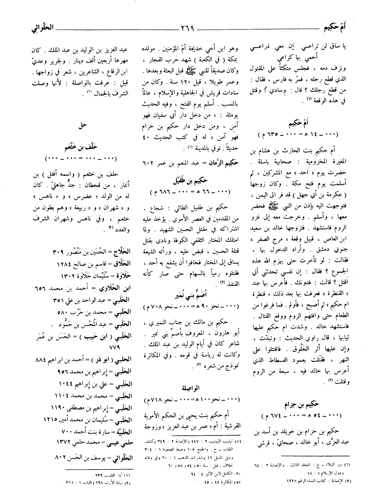 أم حكيم بنت الحارث بن هشام بن المغيرة المخزومية: صحابية باسلة. حضرت يوم (أحد) مع المشركين، ثم أسلمت يوم فتح مكة. وكان زوجها (عكرمة بن أبي جهل) قد فر الى اليمن، فتوجهت اليه بإذن من النبي صلى الله عليه وسلّم فحضر معها، وأسلم. وخرجت معه إلى غزو الروم فاستشهد. فتزوجها خالد بن سعيد ابن العاص، قبيل وقعة (مرج الصفر) جنوبي دمشق.