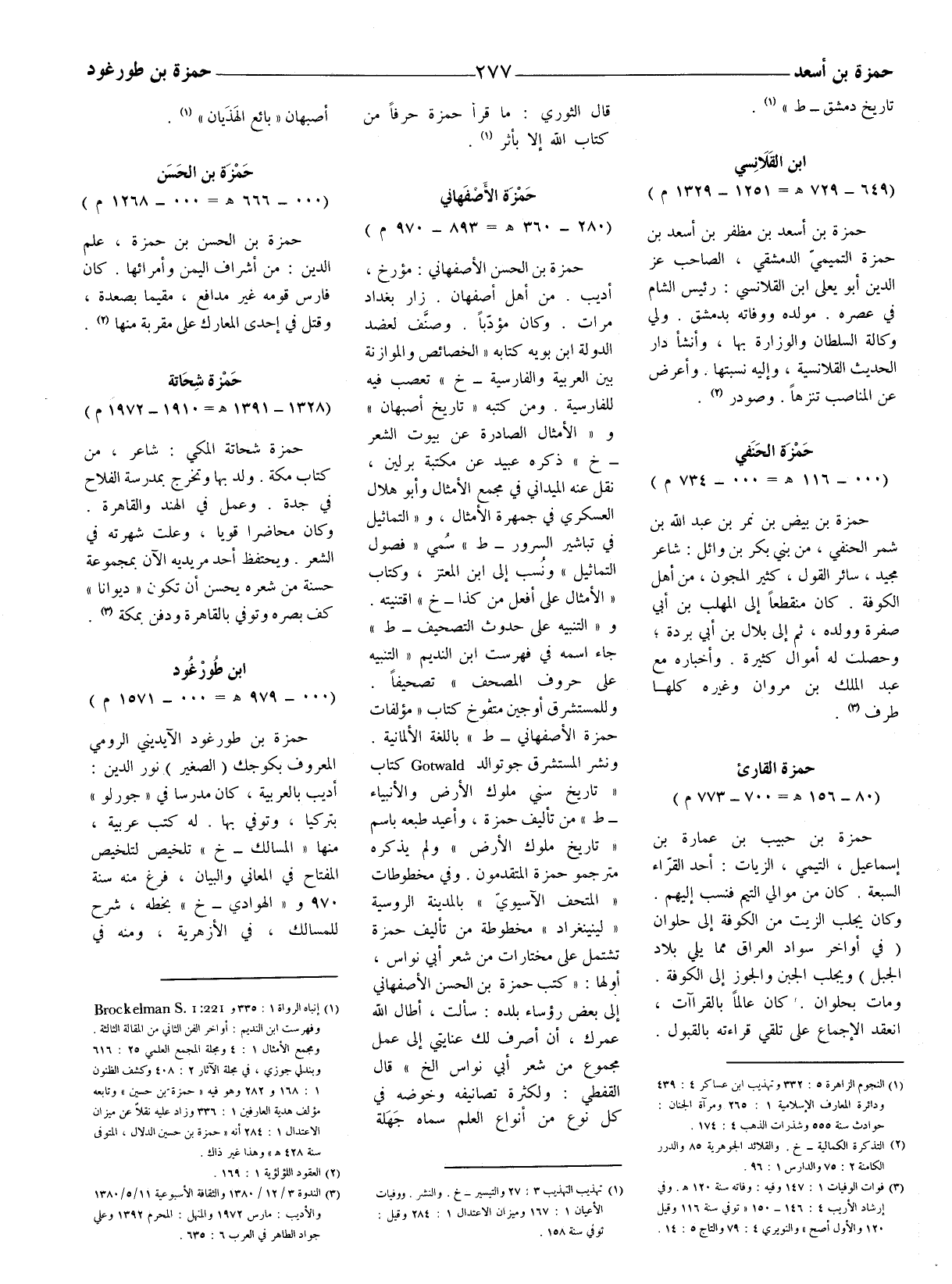حمزة بن الحسن الأصفهاني: مؤرخ، أديب. من أهل أصفهان. زار بغداد مرات. وكان مؤدّبا. وصنّف لعضد الدولة ابن بويه كتابه (الخصائص والموازنة بين العربية والفارسية - خ) تعصب فيه للفارسية. ومن كتبه (تاريخ أصبهان) و (الأمثال الصادرة عن بيوت الشعر - خ) ذكره عبيد عن مكتبة برلين، نقل عنه الميداني في مجمع الأمثال وأبو هلال العسكري في جمهرة الأمثال، و (التماثيل في تباشير السرور - ط) سمي (فصول التماثيل) ونسب إلى ابن المعتز، وكتاب (الأمثال على أفعل من كذا - خ) اقتنيته. و (التنبيه على حدوث التصحيف - ط) جاء اسمه في فهرست ابن النديم (التنبيه على حروف المصحف) تصحيفا. وللمستشرق أوجين متفوخ كتاب (مؤلفات حمزة الأصفهاني - ط) باللغة الألمانية. ونشر المستشرق جوتوالد Gotwald كتاب (تاريخ سني ملوك الأرض والأنبياء - ط) من تأليف حمزة، وأعيد طبعه باسم (تاريخ ملوك الأرض) ولم يذكره مترجمو حمزة المتقدمون. وفي مخطوطات (المتحف الآسيويّ) بالمدينة الروسية (لينينغراد) مخطوطة من تأليف حمزة تشتمل على مختارات من شعر أبي نواس، أولها: (كتب حمزة بن الحسن الأصفهاني إلى بعض رؤساء بلده: سألت، أطال الله عمرك، أن أصرف لك عنايتي إلى عمل مجموع من شعر أبي نواس إلخ) قال القفطي: ولكثرة تصانيفه وخوضه في كل نوع من أنواع العلم سماه جهلة