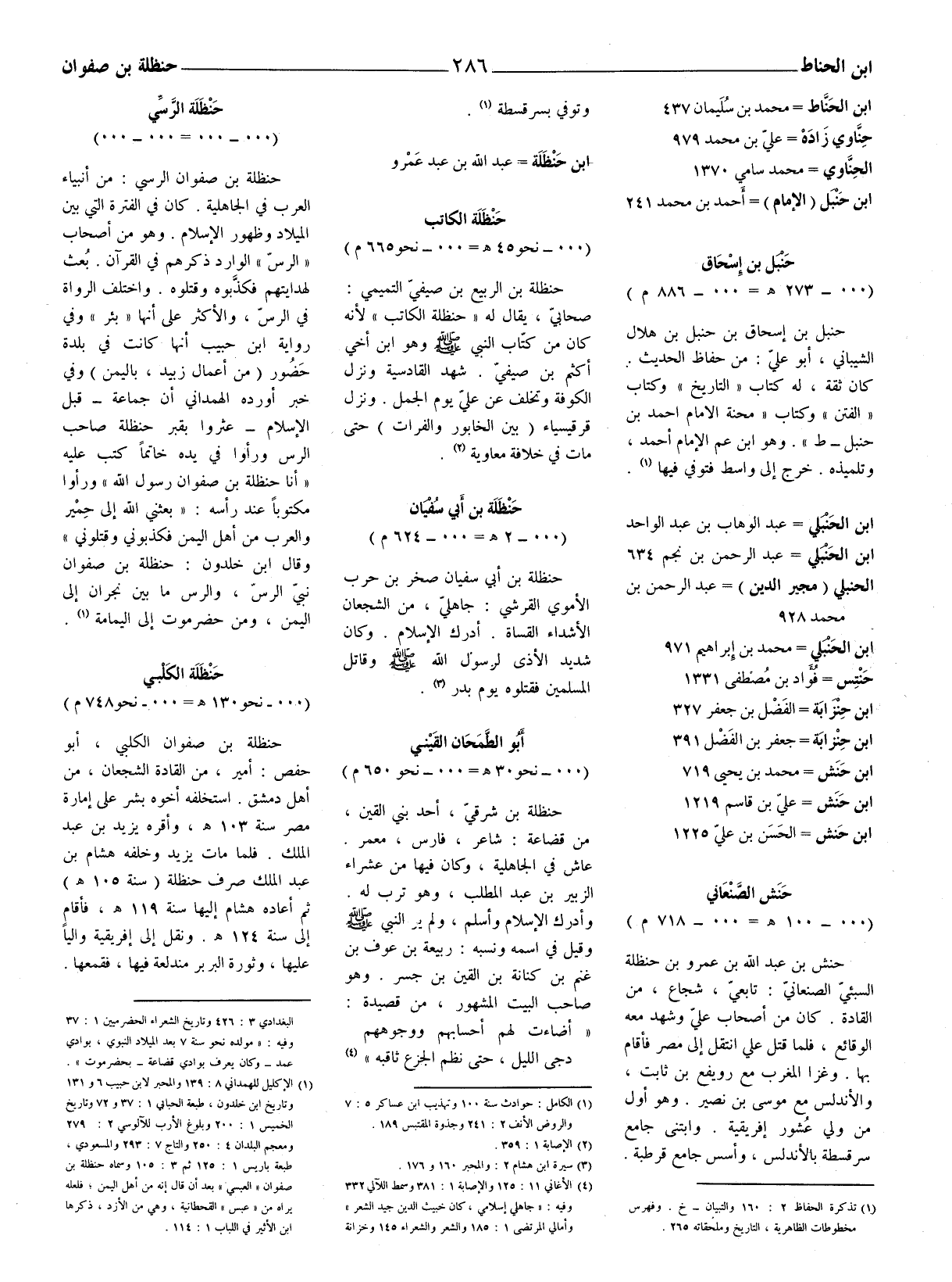 (1) الإكليل للهمداني 8: 139 والمحبر لابن حبيب 6 و 131 وتاريخ ابن خلدون، طبعة الحبابي 1: 37 و 72 وتاريخ الخميس 1: 200 وبلوغ الأرب للآلوسي 2: 279 ومعجم البلدان 4: 250 والتاج 7: 293 والمسعودي، طبعة باريس 1: 125 ثم 3: 105 وسماه حنظلة بن صفوان (العبسيّ) بعد أن قال أنه من أهل اليمن، فلعله يراه من (عبس) القحطانية، وهي من الأزد، ذكرها ابن الأثير في اللباب 1: 114.