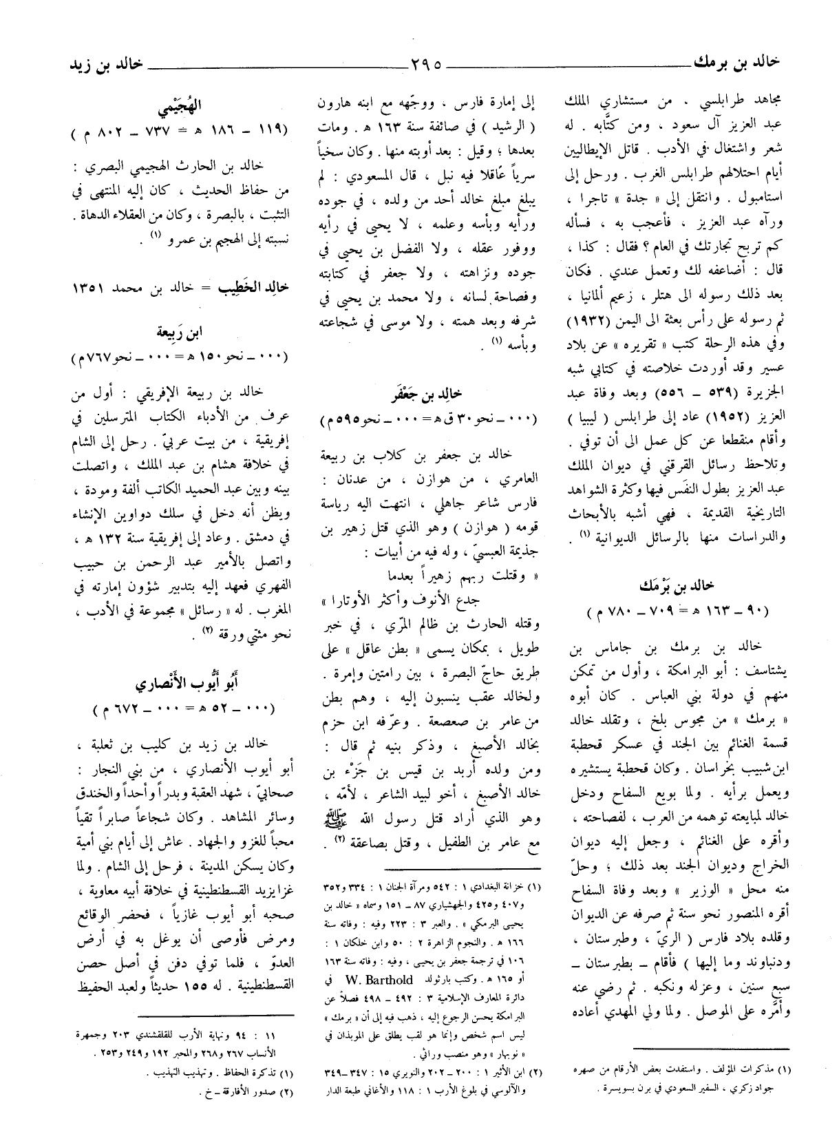 (1) خزانة البغدادي 1: 542 ومرآة الجنان 1: 334 و 352 و 407 و 425 والجهشياري 87 - 151 وسماه (خالد بن يحيى البرمكي) . والعبر 3: 223 وفيه: وفاته سنة 166 هـ
