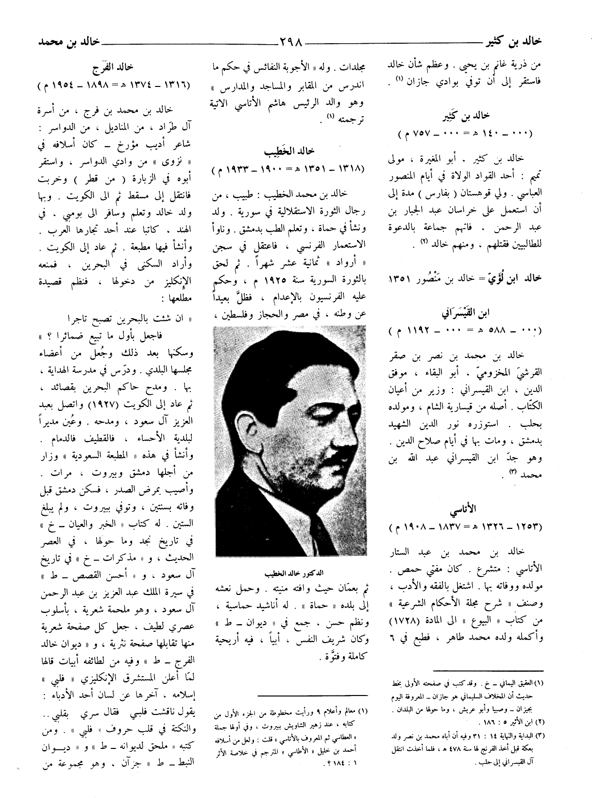 خالد بن محمد الخطيب: طبيب، من رجال الثورة الاستقلالية في سورية. ولد ونشأ في حماة، وتعلم الطب بدمشق. وناوأ الاستعمار الفرنسي، فاعتقل في سجن (أرواد) ثمانية عشر شهرا.