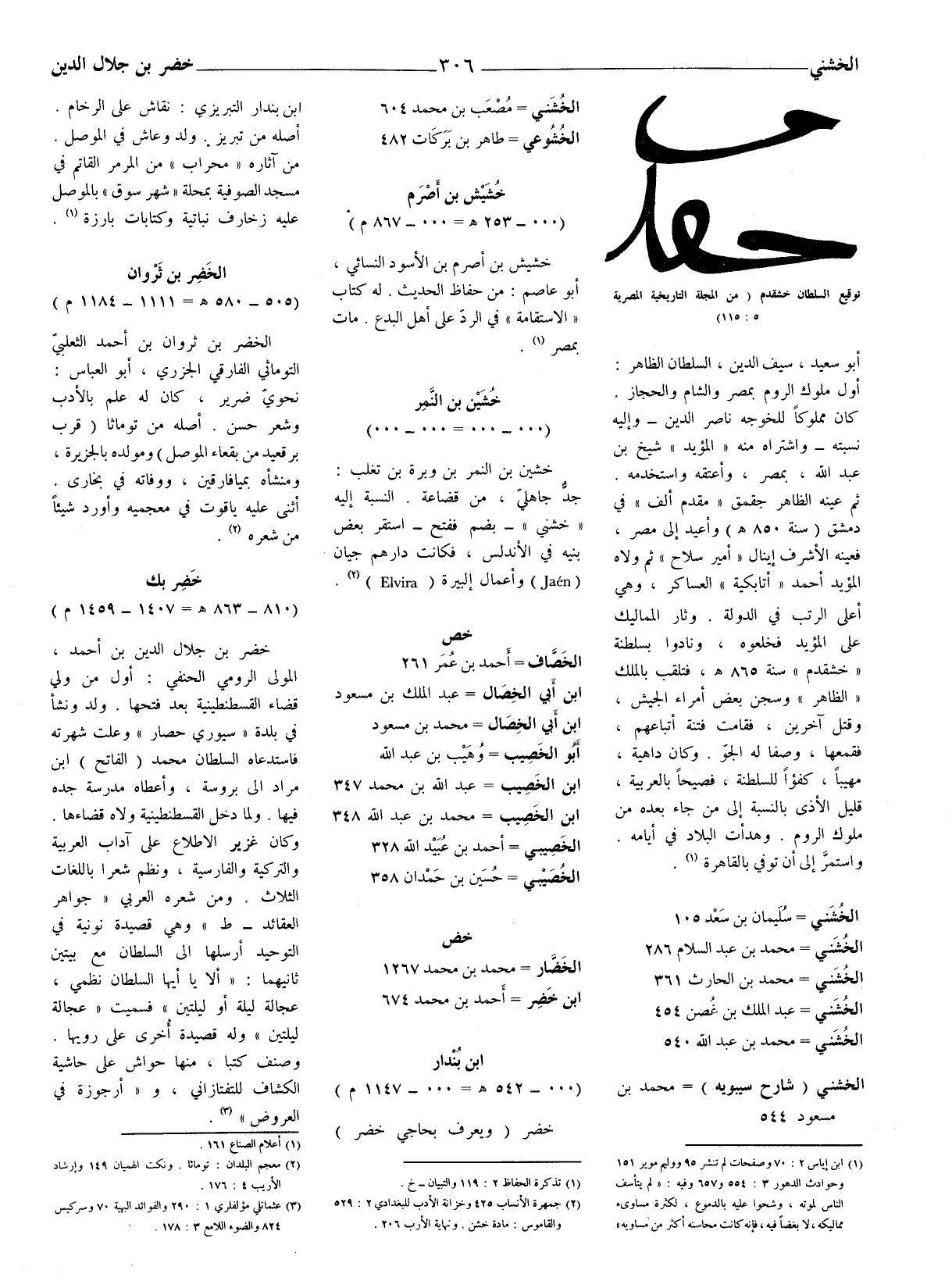 خضر بن جلال الدين بن أحمد، المولى الرومي الحنفي: أول من ولي قضاء القنسطنطينية بعد فتحها. ولد ونشأ في بلدة (سيوري حصار) وعلت شهرته فاستدعاه السلطان محمد (الفاتح) ابن مراد الى بروسة، وأعطاه مدرسة جده فيها. ولما دخل القسطنطينية ولاه قضاءها. وكان غزير الاطلاع على آداب العربية والتركية والفارسية، ونظم شعرا باللغات الثلاث. ومن شعره العربيّ (جواهر العقائد - ط) وهي قصيدة نونية في التوحيد أرسلها الى السلطان مع بيتين ثانيهما: (ألا يا أيها السلطان نظمي، عجالة ليلة أو ليلتين) فسميت (عجالة ليلتين) وله قصيدة أخرى على رويها.