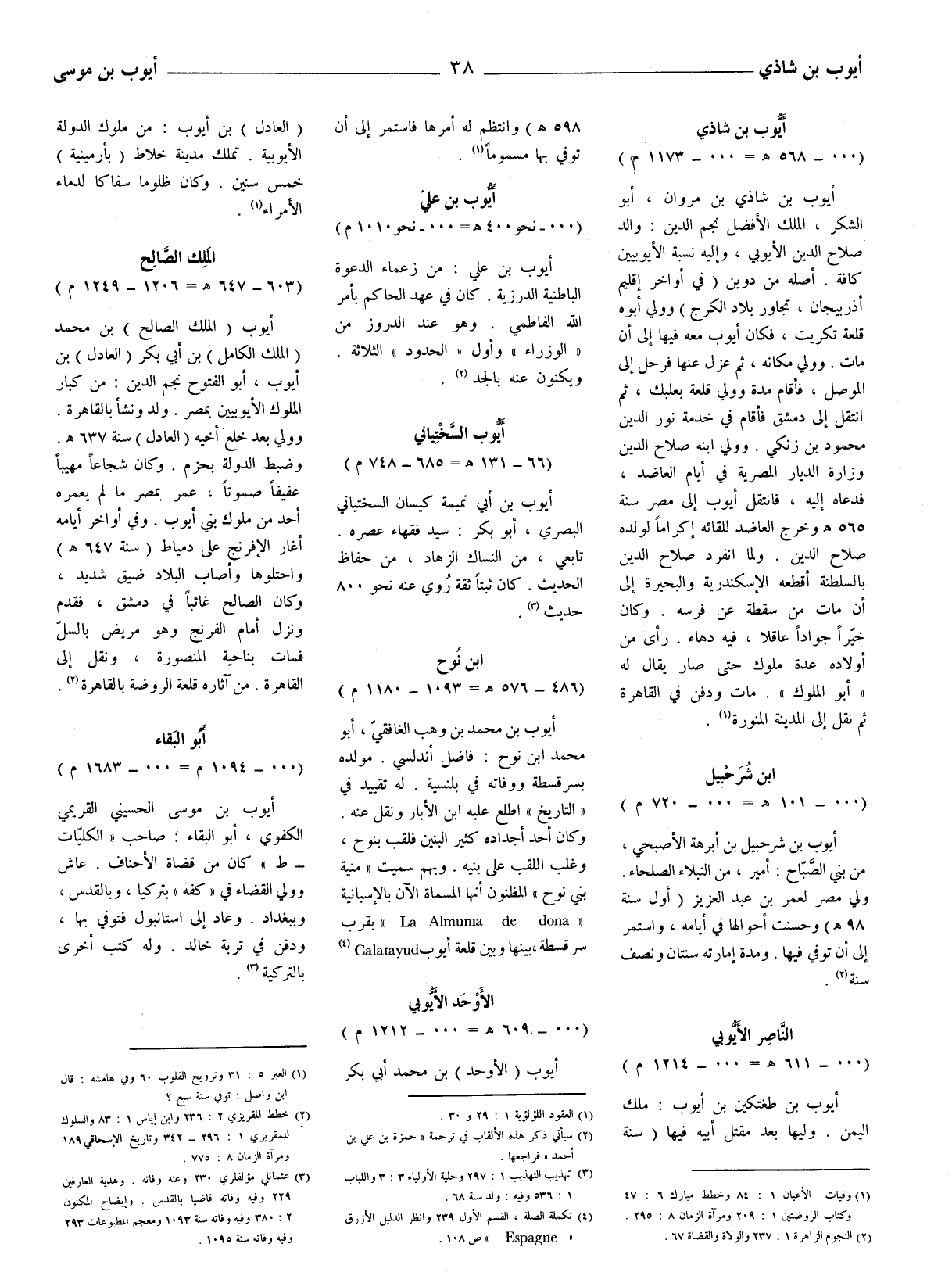 أيوب بن شاذي بن مروان، أبو الشكر، الملك الأفضل نجم الدين: والد صلاح الدين الأيوبي، وإليه نسبة الأيوبيين كافة. أصله من دوين (في أواخر إقليم أذربيجان، تجاور بلاد الكرج) وولي أبوه قلعة تكريت، فكان أيوب معه فيها إلى أن مات. وولي مكانه، ثم عزل عنها فرحل إلى الموصل، فأقام مدة وولي قلعة بعلبكّ، ثم انتقل إلى دمشق فأقام في خدمة نور الدين محمود بن زنكي. وولي ابنه صلاح الدين وزارة الديار المصرية في أيام العاضد، فدعاه إليه، فانتقل أيوب إلى مصر سنة 565هـ وخرج العاضد للقائه إكراما لولده صلاح الدين. ولما انفرد صلاح الدين بالسلطنة أقطعه الإسكندرية والبحيرة إلى أن مات من سقطة عن فرسه. وكان خيّرا جوادا عاقلا، فيه دهاء. رأى من أولاده عدة ملوك حتى صار يقال له (أبو الملوك) . مات ودفن في القاهرة ثم نقل إلى المدينة المنورة (1) .