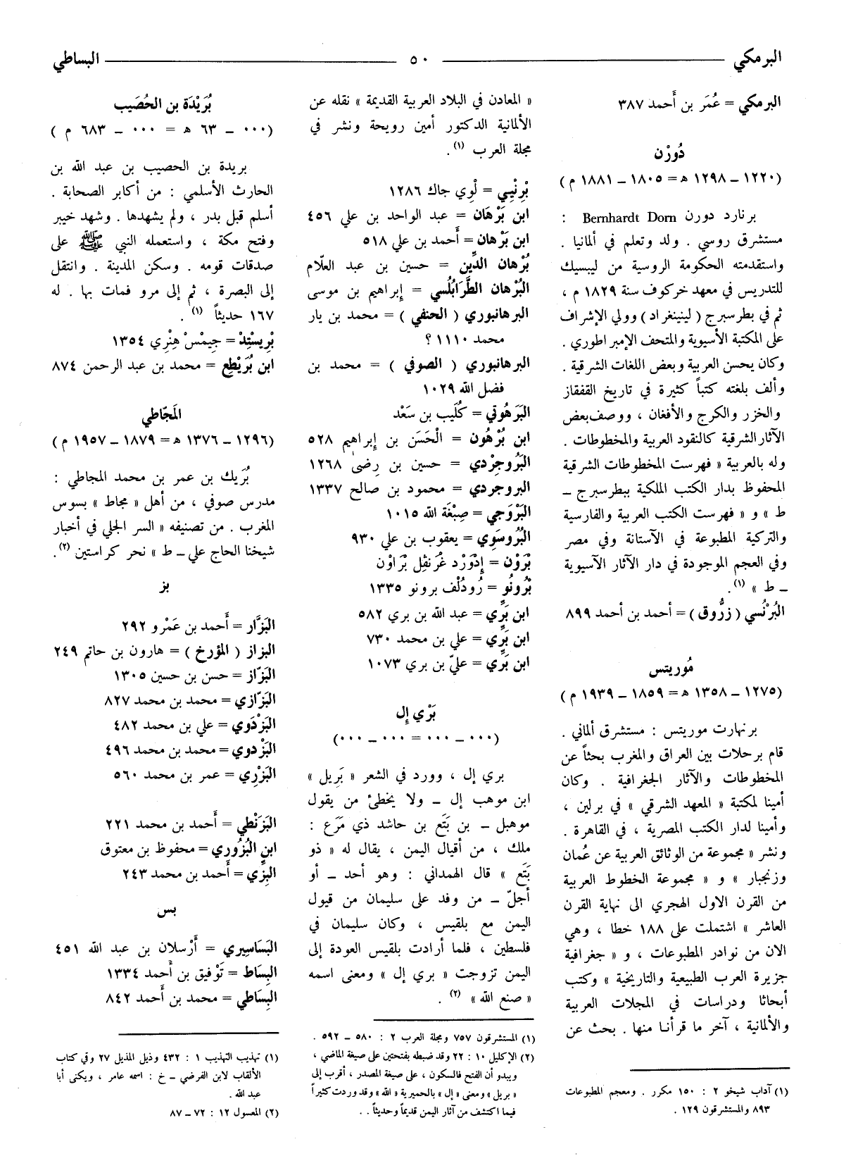 برنارد دورن: Bernherdt Dorn مستشرق روسي. ولد وتعلم في ألمانيا. واستقدمته الحكومة الروسية من ليبسيك للتدريس في معهد خركوف سنة 1829 م، ثم في بطرسبرج (لينينغراد) وولي الإشراف على المكتبة الأسيوية والمتحف الإمبراطوري. وكان يحسن العربية وبعض اللغات الشرقية. وألف بلغته كتبا كثيرة في تاريخ القفقاز والخزر والكرج والأفغان، ووصف بعض الآثار الشرقية كالنقود العربية والمخطوطات. وله بالعربية (فهرست المخطوطات الشرقية المحفوظ بدار الكتب الملكية ببطرسبرج - ط) و (فهرست الكتب العربية والفارسية والتركية المطبوعة في الآستانة وفي مصر وفي العجم الموجودة في دار الآثار الآسيوية - ط) (1) البُرْنُسي (زرُّوق) = أحمد بن أحمد 899