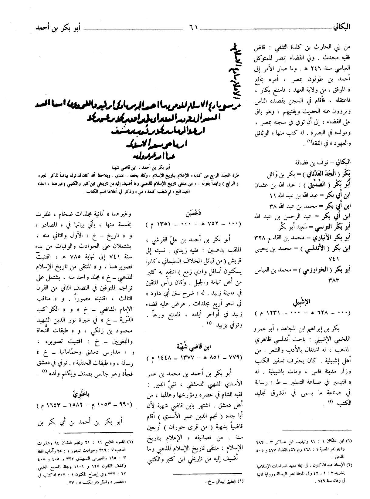 (1) الضوء اللامع 11: 21 ونظم العقيان 94 وشذرات الذهب 7: 269 وحوادث الدهور 1: 25 وآداب اللغة 3: 195 والفهرس التمهيدي 322 و 405 و 407 وكشف الظنون 127 و 1101 ومجلة المجمع العلمي 22: 232 وفي إيضاح المكنون 1: 302 له كتاب في (التفسير) وانظر دار الكتب 5: 33.