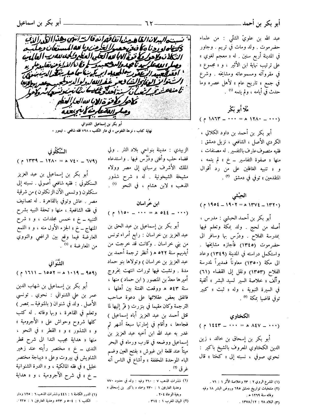 أبو بكر بن إسماعيل بن شهاب الدين عمر بن علي الشنواني: نحوي. تونسيّ الأصل. ولد في شنوان (بالمنوفية - بمصر) وتعلم في القاهرة، وبها وفاته. له كتب كلها شروح وحواش علي (الأجرومية) و (الشذور) و (القطر) في النحو، منها (هداية مجيب الندا إلى شرح قطر الندى - خ) مختصر رأيته عند زهير الشاويش في بيروت وعلى (ديباجة مختصر خليل) في فقه المالكية، و (الدرة الشنوانية - خ) في شرح الآجرومية، و (هداية
