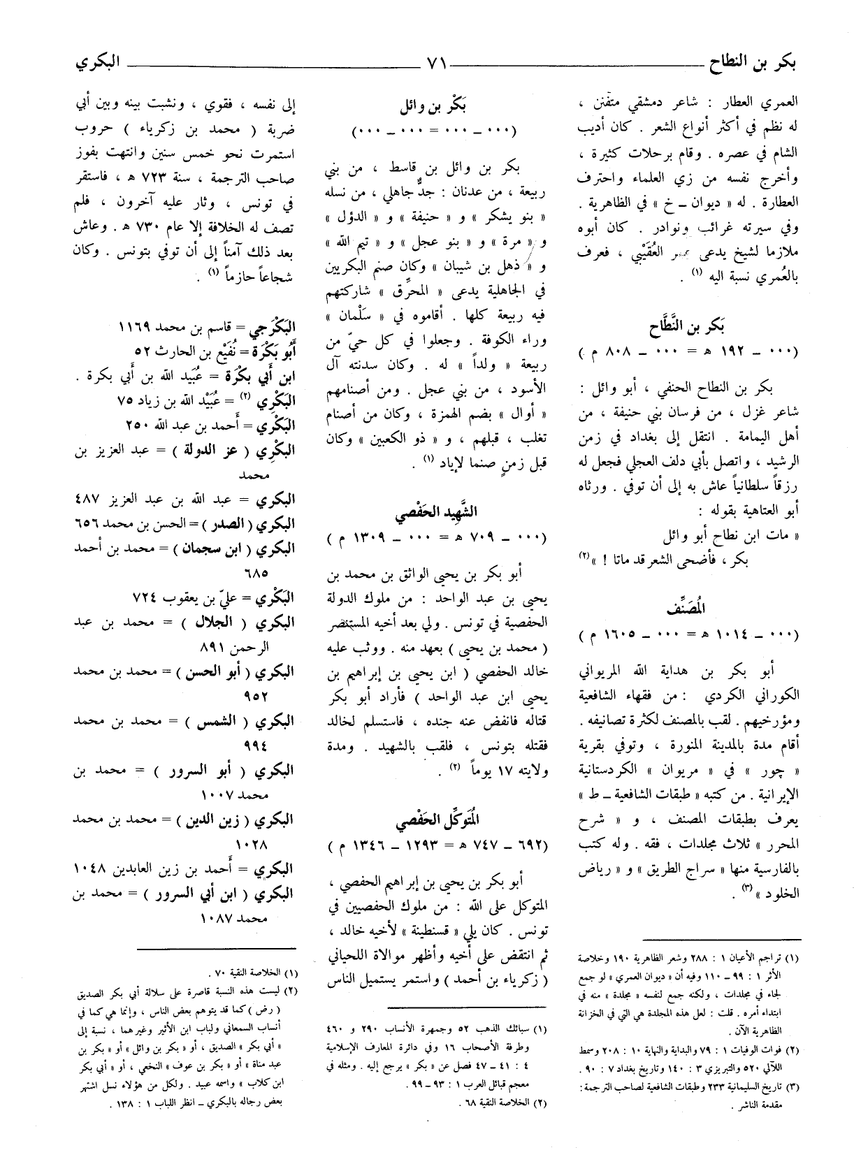 (2) ليست هذه النسبة قاصرة على سلالة أبي بكر الصديق (رض) كما قد يتوهم بعض الناس، وإنما هي كما في أنساب السمعاني ولباب ابن الأثير وغيرهما، نسبة إلى (أبي بكر) الصديق، أو (بكر بن وائل) أو (بكر بن عبد مناة) أو (بكر بن عوف) النخعي، أو (أبي بكر ابن كلاب) واسمه عبيد. ولكل من هؤلاء نسل اشتهر بعض رجاله بالبكري - انظر اللباب 1: 138.