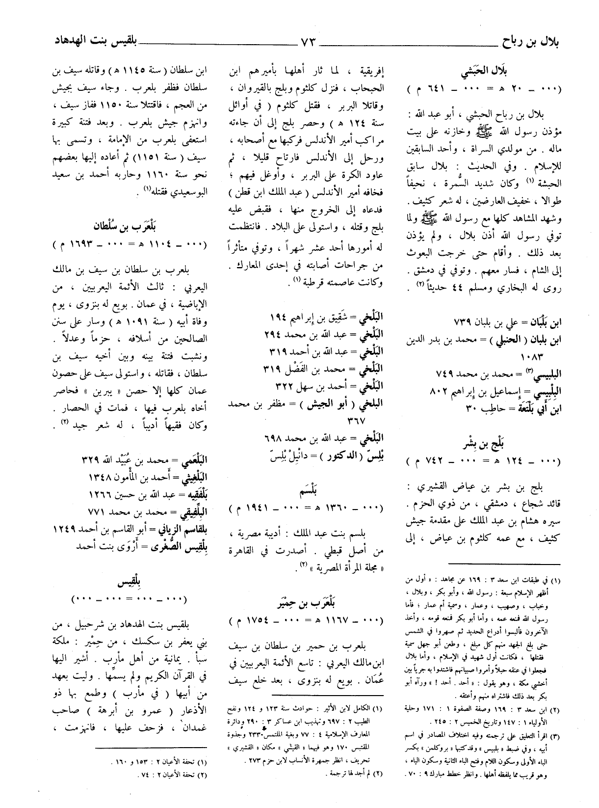 بلال بن رباح الحبشي، أبو عبد الله: مؤذن رسول الله صلّى الله عليه وسلم وخازنه على بيت ماله. من مولدي السراة، وأحد السابقين للإسلام. وفي الحديث: بلال سابق الحبشة (1) وكان شديد السمرة، نحيفا طوالا، خفيف العارضين، له شعر كثيف. وشهد المشاهد كلها مع رسول الله صلّى الله عليه وسلم ولما توفي رسول الله أذن بلال، ولم يؤن بعد ذلك. وأقام حتى خرجت البعوث إلى الشام، فسار معهم. وتوفي في دمشق. روى له البخاري ومسلم 44 حديثا (2) .