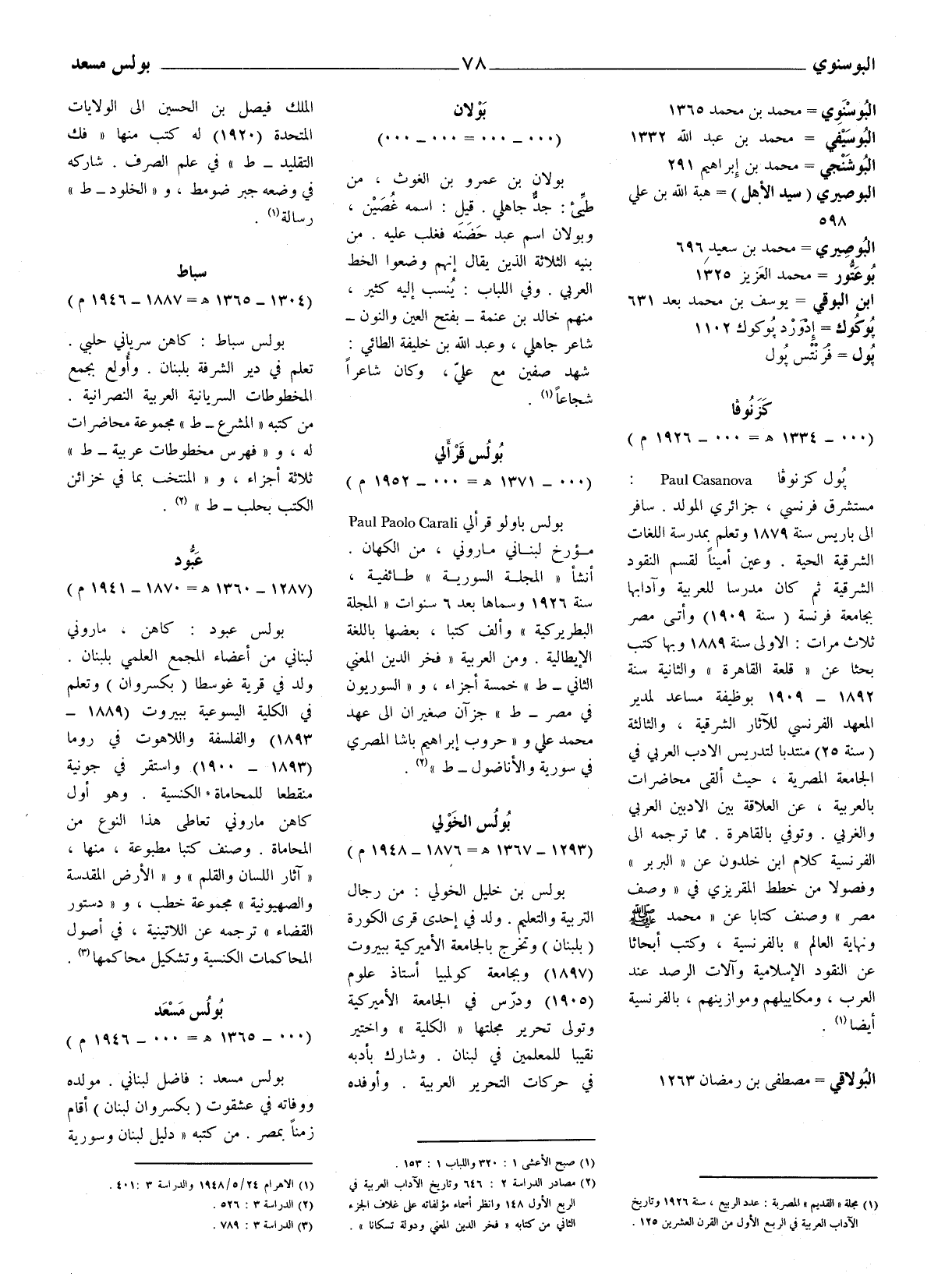 بول كزنوفا: Paul Casanova مستشرق فرنسي، جزائري المولد. سافر إلى باريس سنة 1879 وتعلم بمدرسة اللغات الشرقية الحية. وعين أمينا لقسم النقود الشرقية ثم كان مدرسا للعربية وآدابها بجامعة فرنسة (سنة 1909) وأتى مصر ثلاث مرات: الأولى سنة 1889 وبها كتب بحثا عن (قلعة القاهرة) والثانية سنة 1892 - 1909 بوظيفة مساعد لمدير المعهد الفرنسي للآثار الشرقية، والثالثة (سنة 25) منتدبا لتدريس الأدب العربيّ في الجامعة المصرية، حيث ألقى محاضرات بالعربية، عن العلاقة بين الأدبين العربيّ والغربي. وتوفي بالقاهرة. مما ترجمة إلى الفرنسية كلام ابن خلدون عن (البربر) وفصولا من خطط المقريزي في (وصف مصر) وصنف كتابا عن (محمد صلّى الله عليه وسلّم ونهاية العالم) بالفرنسية، وكتب أبحاثا عن النقود الإسلامية وآلات الرصد عند العرب، ومكاييلهم وموازينهم، بالفرنسية أيضا (1) .