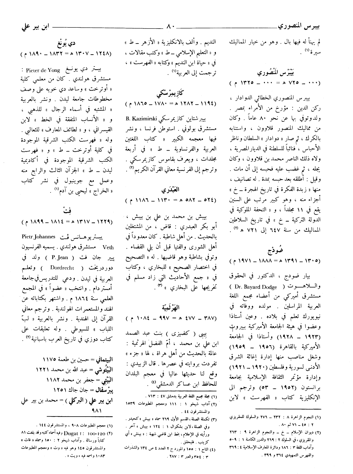 بيبرشتاين كازيمرسكي. B Kazimirski مستشرق بولوني. استوطن فرنسا ونشر فيها معجمه الكبير (كتاب اللغتين العربية والفرنساوية - ط) في أربعة مجلدات، ويعرف بقاموس كازيمرسكي. وترجم إلى الفرنسية معاني القرآن الكريم (2) .