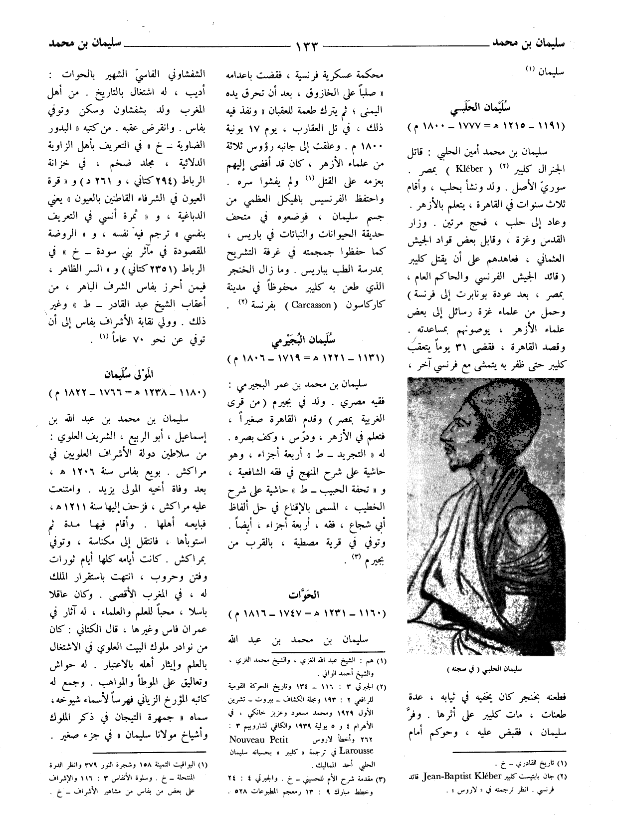 (2) الجبرتي 3: 116 - 134 وتاريخ الحركة القومية للرافعي 2: 193 ومجلة الكشاف - بيروت - تشرين الأول 1929 ومحمد مسعود وعزيز خانكي، في الأهرام 4 و 5 يولية 1939 والكافي لشاروبيم 3: 262 وأخطأ لاروس Nouveau Petit Larousse في ترجمة (كليبر) بحسبانه سليمان الحلبي أحد المماليك.