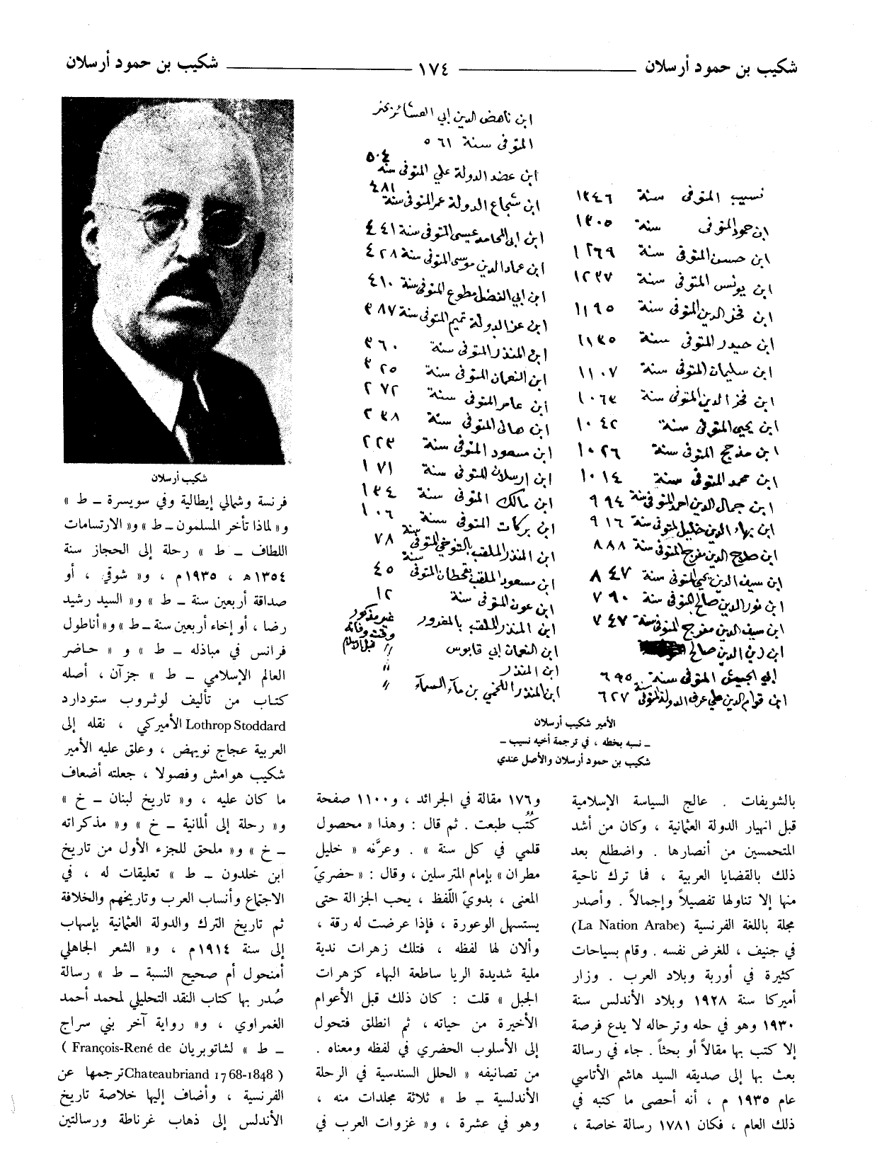 فرنسة وشمالي إيطالية وفي سويسرة - ط) و (لماذا تأخر المسلمون - ط) و (الارتسامات اللطاف - ط) رحلة إلى الحجاز سنة 1354 هـ 1935 م، و (شوقي، أو صداقة أربعين سنة - ط) و (السيد رشيد رضا، أو إخاء أربعين سنة - ط) و (أنا طول فرانس في مباذله - ط) و (حاضر العالم الإسلامي - ط) جزآن، أصله كتاب من تأليف لوثروب ستودارد Lothrop Stoddard الأميركي، نقله إلى العربية عجاج نويهض، وعلق عليه الأمير شكيب هوامش وفصولا، جعلته أضعاف ما كان عليه، و (تاريخ لبنان - خ) و (رحلة إلى ألمانية - خ) و (مذكراته - خ) و (ملحق للجزء الأول من تاريخ ابن خلدون - ط) تعليقات له، في الاجتماع وأنساب العرب وتاريخهم والخلافة ثم تاريخ الترك والدولة العثمانية بإسهاب إلى سنة 1914 م، و (الشعر الجاهلي أمنحول أم صحيح النسبة - ط) رسالة صدر بها كتاب النقد التحليلي لمحمد أحمد الغمراوي، و (رواية آخر بني سراج - ط) لشاتوبريان) Francois - Rene de (1848 - 1768 Chateaubriand ترجمها عن الفرنسية، وأضاف إليها خلاصة تاريخ الأندلس إلى ذهاب غرناطة ورسالتين