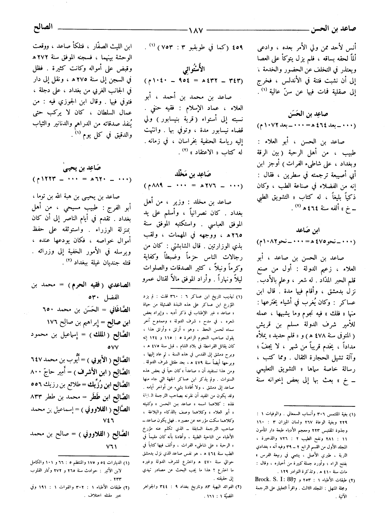 (1) تهذيب تاريخ ابن عساكر 6: 360 قلت: لم يزد المؤرخ ابن عساكر على هذه النبذة الضئيلة من حياة (صاعد) غير الإطناب في ذكر أدبه، وإيراد بعض شعره، في مدح (شرف الدولة) وممدوح آخر سماه لحسن الحظ، وهو (أرتق) وأرتق هذا، يقول صاحب النجوم الزاهرة 5: 115 و 124 إنه كان يقاتل القرامطة في بلاد الشام، قبل سنة 475 هـ وبرح دمشق إلى القدس في هذه السنة، ثم عاد إليها، وبرحها أيضا سنة 479 هـ بعد مقتل شرف الدولة. ومن هذا نستفيد أن (صاعدا) كان حيا في بعض هذه السنوات. ولم يذكر ابن عساكر الجهة التي جاء منها صاعد إلى دمشق، ولا أفادنا بشئ عن أواخر أيامه. وقد يكون من المفيد أن نقرنه بصاحب الترجمة السابقة لهذه: كلاهما اسمه (صاعد بن الحسن) وكنيته (أبو العلاء) وكلاهما وصف بالذكاء والبلاغة، وكلاهما سكت مؤرخه عن مصيره. فهل يكون صاعد - صاحب الترجمة السابقة - الذي تكلم عنه مؤرخ الاطباء من الناحية الطبية، وأفادنا بأنه كان مقيما في (الرحبة) على شاطئ الفرات، وألف فيها كتابا في الطب سنة 464 هـ هو نفس صاعد الذي نزل بدمشق حوالي سنة 470هـ واخترع لشرف الدولة وغيره ما اخترع؟ هذا ما يجب البحث عن مصادر تهدي إلى حقيقته.
