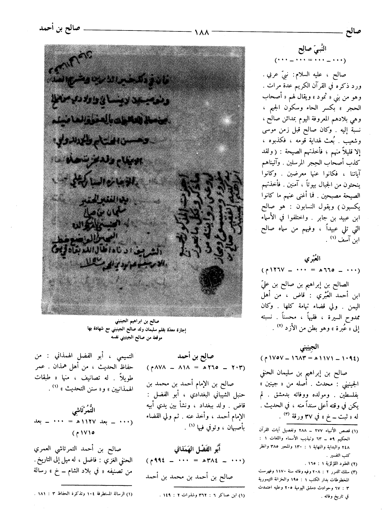 صالح بن إبراهيم بن سليمان الحنفي الجينيني: محدث. أصله من (جينين) بفلسطين. ومولده ووفاته بدمشق. لم يكن في وقته أعلى سندا منه، في الحديث. له (ثبت - خ) في 37 ورقة (3) .