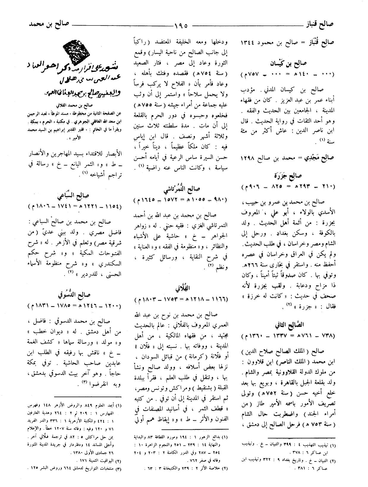 صالح بن محمد بن نوح بن عبد الله العَمْري المعروف بالفلّاني: عالم بالحديث مجتهد، من فقهاء المالكية، من أهل المدينة، ووفاته بها. نسبته إلى (فلّان) أو فلّانة (كرمانة) من قبائل السودان، نزلها بعض أسلافه، وولد صالح ونشأ بها، وتنقل في طلب العلم، فقرأ ببلدة القبلة (بشنقيط) ومراكش وتونس ومصر، ثم استقر في المدينة إلى أن توفي. من كتبه (قطف الثمر، في أسانيد المصنفات في الفنون والأثر - ط) و (إيقاظ همم أولي