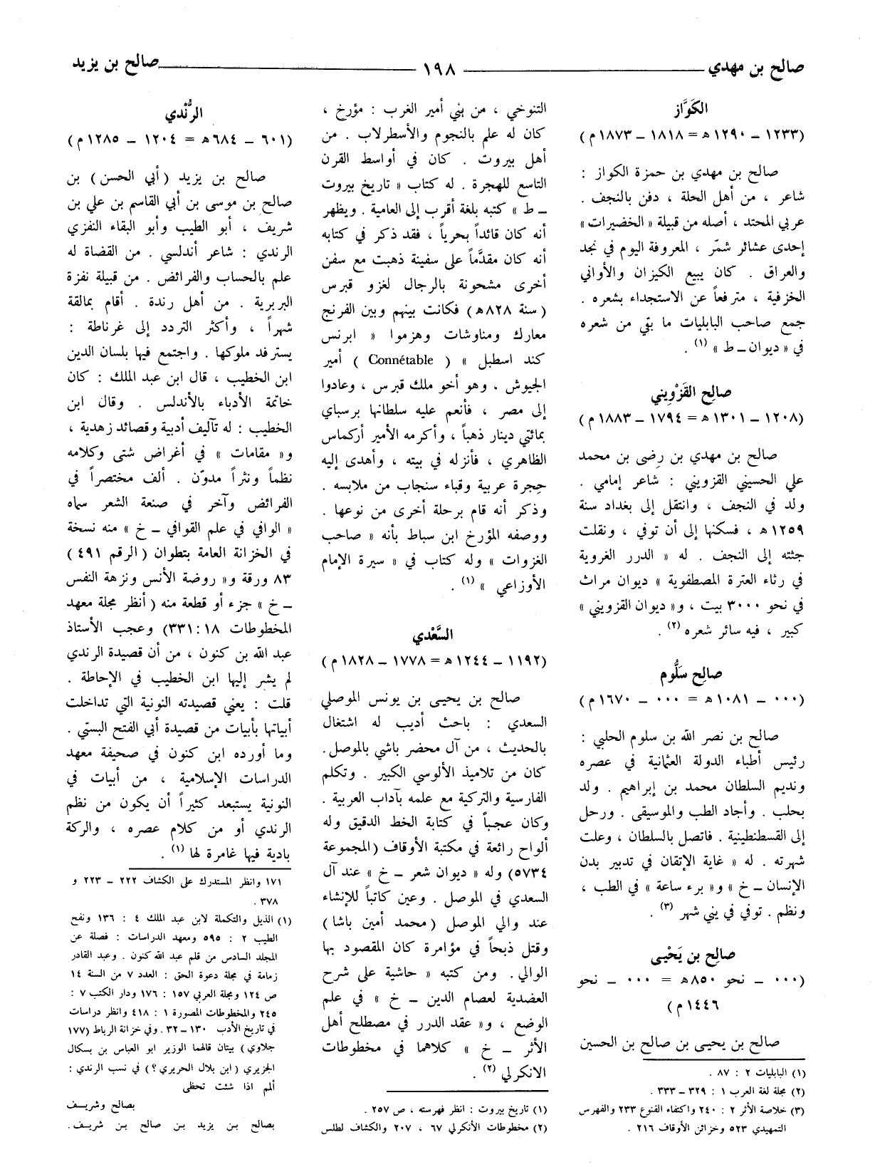صالح بن يحيى بن يونس الموصلي السعدي: باحث أديب له اشتغال بالحديث، من آل محضر باشي بالموصل. كان من تلاميذ الألوسي الكبير. وتكلم الفارسية والتركية مع علمه بآداب العربية. وكان عجبا في كتابة الخط الدقيق وله ألواح رائعة في مكتبة الأوقاف (المجموعة 5734) وله (ديوان شعر - خ) عند آل السعدي في الموصل. وعين كاتبا للإنشاء عند والي الموصل (محمد أمين باشا) وقتل ذبحا في مؤامرة كان المقصود بها الوالي. ومن كتبه (حاشية على شرح العضدية لعصام الدين - خ) في علم الوضع، و (عقد الدرر في مصطلح أهل الأثر - خ) كلاهما في مخطوطات الانكرلي (2) .