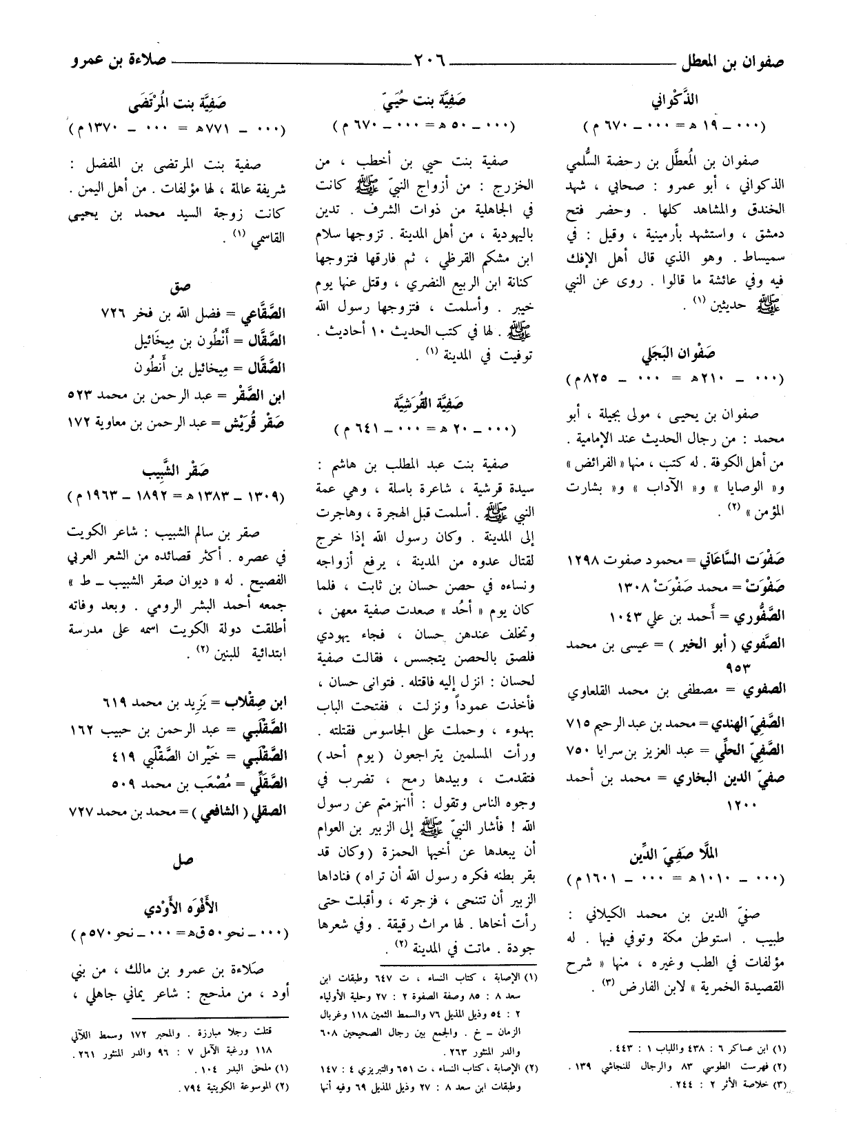صفية بنت عبد المطلب بن هاشم: سيدة قرشية، شاعرة باسلة، وهي عمة النبي صلى الله عليه وسلّم. أسلمت قبل الهجرة، وهاجرت إلى المدينة. وكان رسول الله إذا خرج لقتال عدوه من المدينة، يرفع أزواجه ونساءه في حصن حسان بن ثابت، فلما كان يوم (أحد) صعدت صفية معهن، وتخلف عندهن حسان، فجاء يهودي فلصق بالحصن يتجسس، فقالت صفية لحسان: انزل إليه فأقتله. فتوانى حسان، فأخذت عمودا ونزلت، ففتحت الباب بهدوء، وحملت على الجاسوس فقتلته. ورأت المسلمين يتراجعون (يوم أحد) فتقدمت، وبيدها رمح، تضرب في وجوه الناس وتقول: أانهزمتم عن رسول الله! فأشار النبي صلى الله عليه وسلم إلى الزبير بن العوام أن يبعدها عن أخيها الحمزة (وكان قد بقر بطنه فكره رسول الله أن تراه) فناداها الزبير أن تتنحى، فزجرته، وأقبلت حتى رأت أخاها. لها مراث رقيقة. وفي شعرها جودة. ماتت في المدينة (2) .