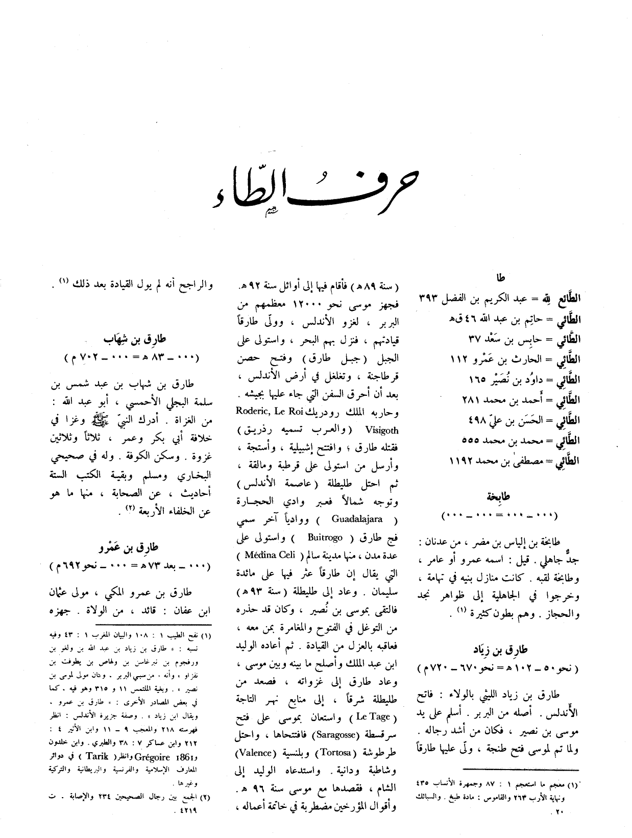 (1) نفح الطيب 1: 108 والبيان المغرب 1: 43 وفيه نسبه: (طارق بن زياد بن عبد الله بن ولغو بن ورفجوم بن نبرغاسن بن ولهاص بن يطوفت بن نفزاو) وأنه (من سبي البربر، وكان مولى لموسى بن نصير) . وبغية الملتمس 11 و 315 وهو فيه، كما في بعض المصادر الأخرى: (طارق بن عمرو، ويقال ابن زياد) . وصفة جزيرة الأندلس: انظر فهرسته 218 والمعجب 9 - 11 وابن الأثير 4: 212 وابن عساكر 7: 38 والطبري. وابن خلدون و Gregoire1861 وانظر (Tarik) في دوائر المعارف الإسلامية والفرنسية والبريطانية والتركية وغيرها.