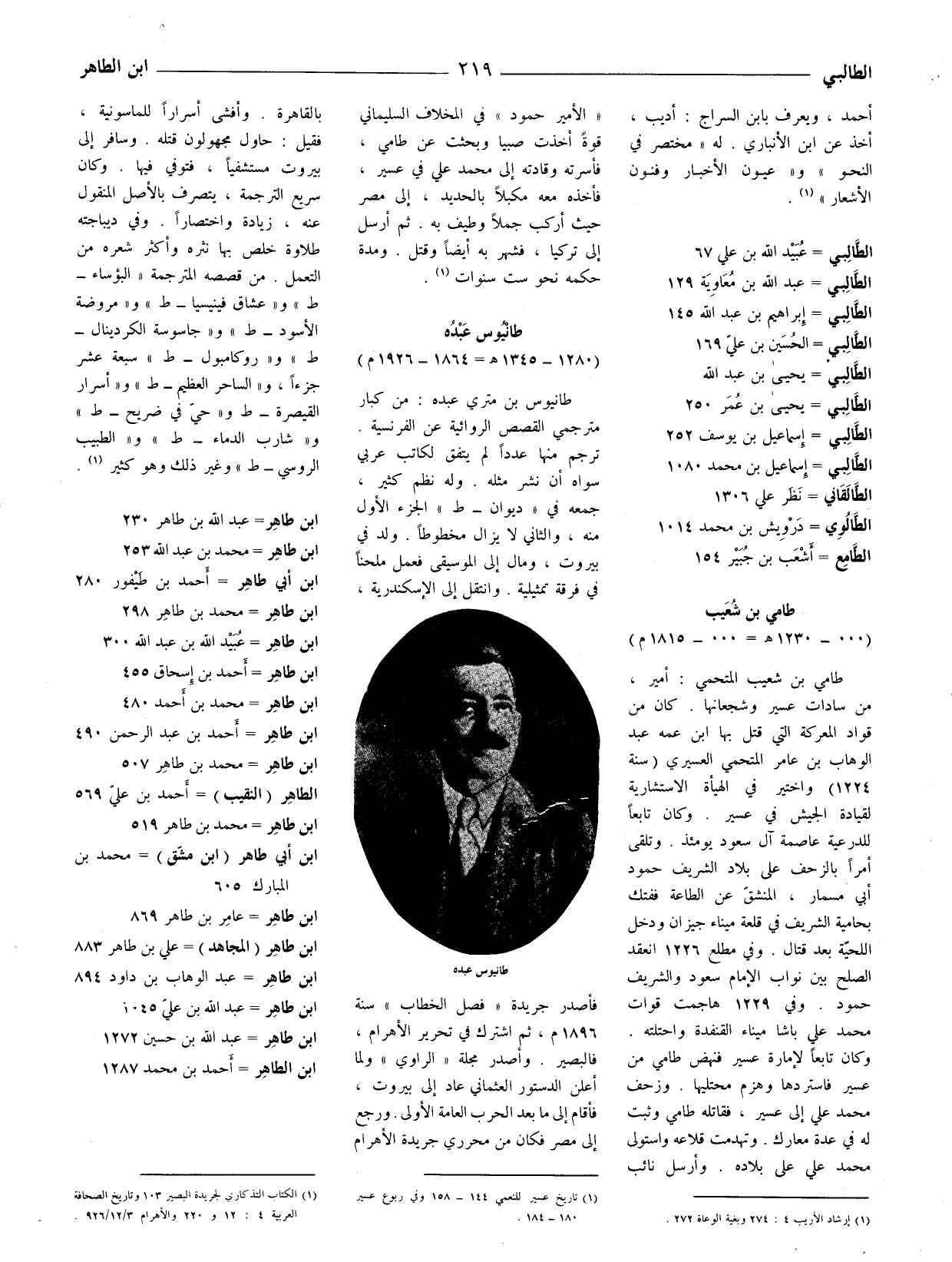 طانيوس بن متري عبده: من كبار مترجمي القصص الروائية عن الفرنسية. ترجم منها عددا لم يتفق لكاتب عربي سواه أن نشر مثله. وله نظم كثير، جمعه في (ديوان - ط) الجزء الأول منه، والثاني لا يزال مخطوطا. ولد في بيروت، ومال إلى الموسيقى فعمل ملحنا في فرقة تمثيلية. وانتقل إلى الإسكندرية، فأصدر جريدة (فصل الخطاب) سنة 1896 م، ثم اشترك في تحرير الأهرام، فالبصير. وأصدر مجلة (الراويّ) ولما أعلن الدستور العثماني عاد إلى بيروت، فأقام إلى ما بعد الحرب العامة الأولى. ورجع إلى مصر فكان من محرري جريدة الاهرام