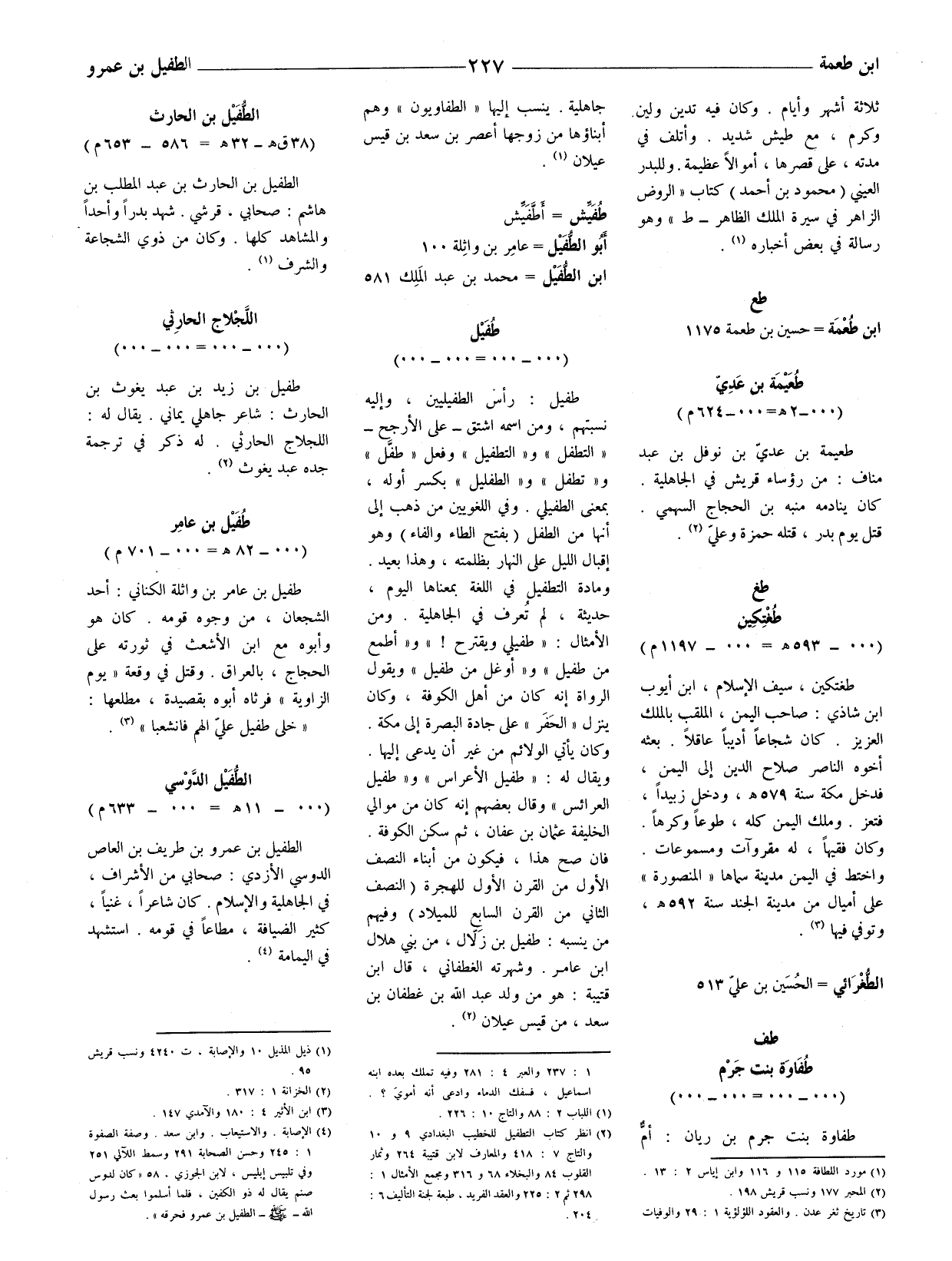 (4) الإصابة. والاستيعاب. وابن سعد. وصفة الصفوة 1: 245 وحسن الصحابة 291 وسمط اللآلي 251 وفي تلبيس إبليس، لابن الجوزي، 58 (كان لدوس صنم يقال له ذو الكفين، فلما أسلموا بعث رسول الله - صلّى الله عليه وسلم - الطفيل بن عمرو فحرقه) .