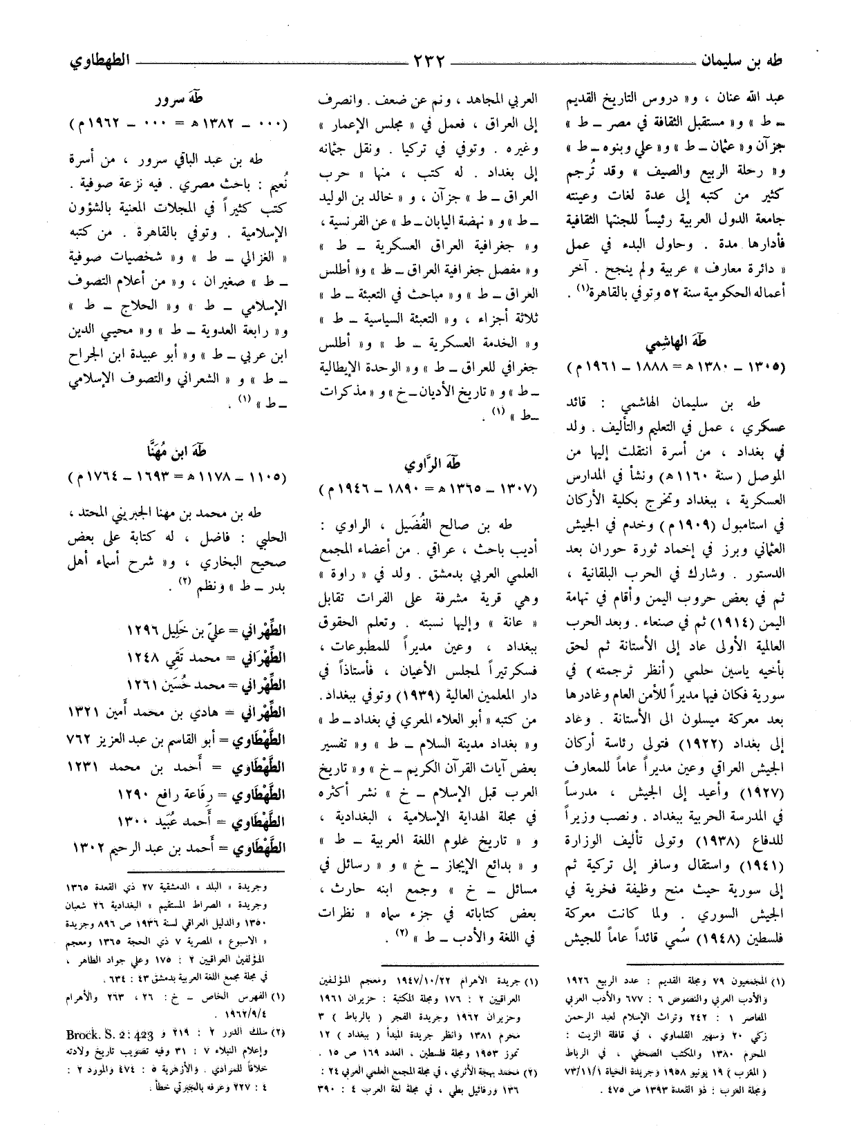 طه بن سليمان الهاشمي: قائد عسكري، عمل في التعليم والتأليف. ولد في بغداد، من أسرة انتقلت إليها من الموصل (سنة 1160 هـ ونشأ في المدارس العسكرية، ببغداد وتخرج بكلية الأركان في استامبول (1909 م) وخدم في الجيش العثماني وبرز في إخماد ثورة حوران بعد الدستور.