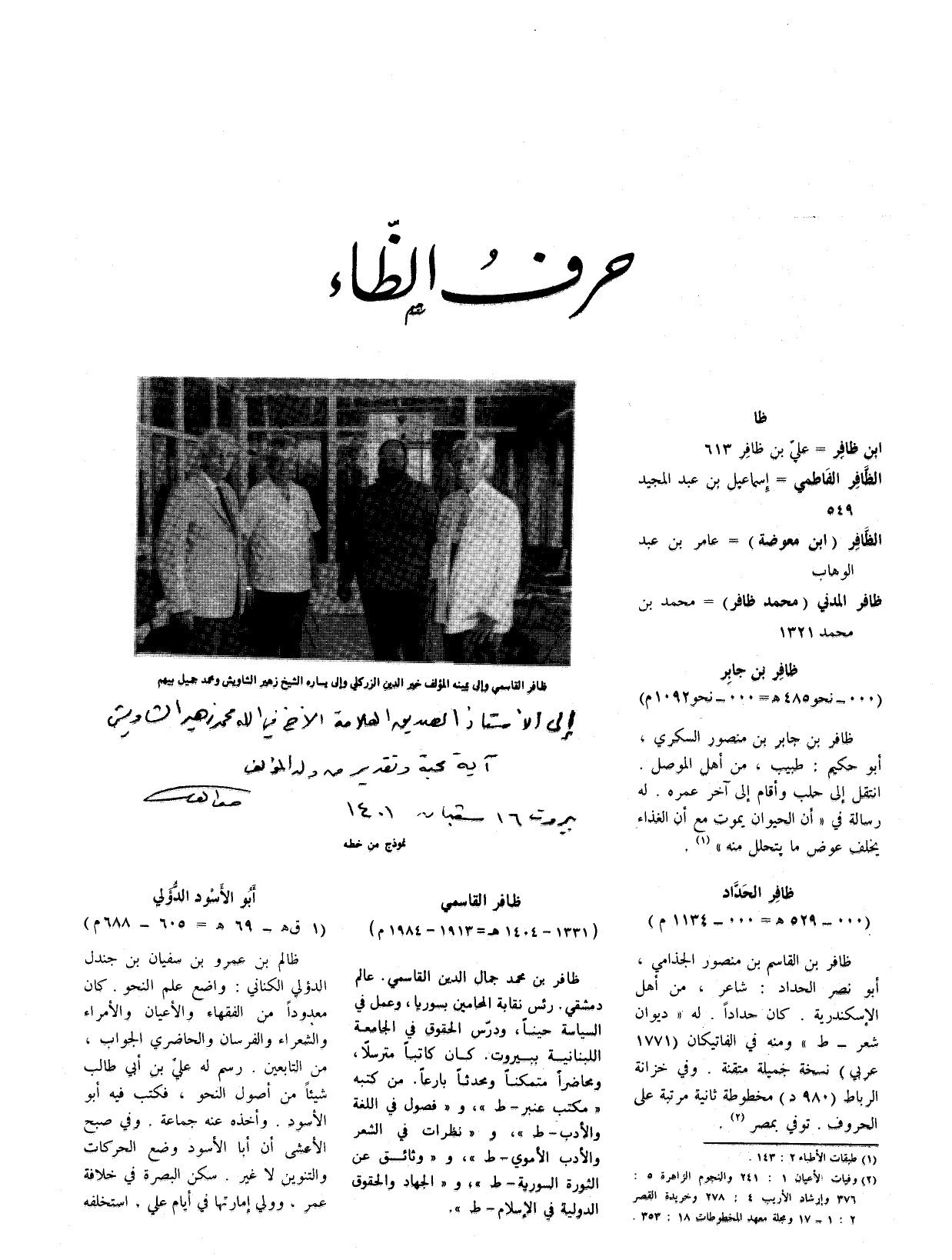 ظافر بن محمد جمال الدين القاسمي عالم دمشقي. رئيس نقابة المحامين بسوريا وعمل في السياسة حينا ودرس الحقوق في الجامعة اللبنانية ببيروت كان كاتبا مترسلا ومحاضرا متمكنا ومحدثا بارعا. من كتبه (مكتب العنبر - ط) و (فصول فب اللغة والأدب - ط) و (نظرات في الشعر والأدب الأموي - ط) و (وثائق عن الثورة السورية - ط) و (الجهاد والحقوق الدولية في الإسلام- ط) .