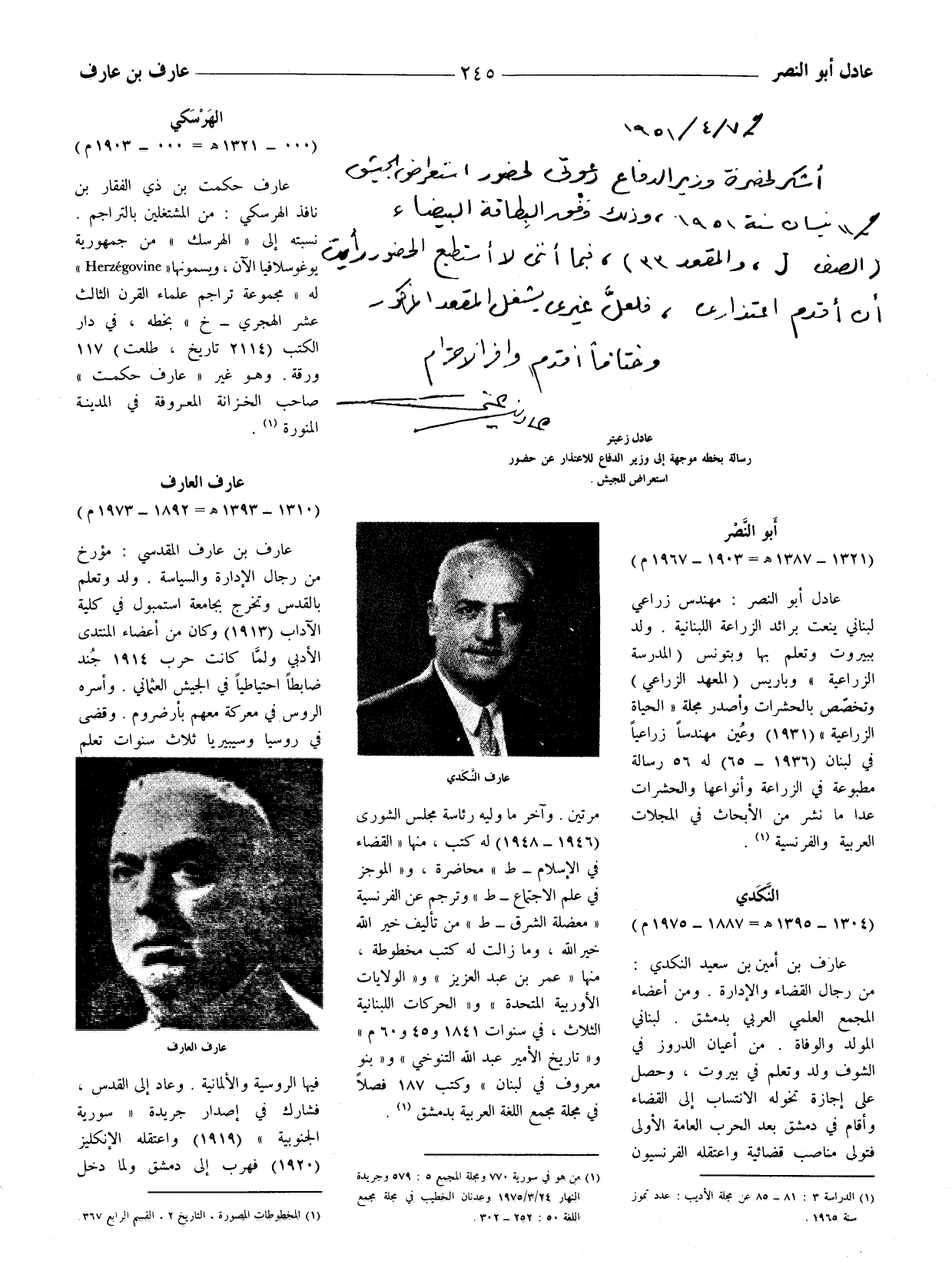 (1) من هو في سورية 770 ومجلة المجمع 5: 579 وجريدة النهار 24 / 3 / 1975 وعدنان الخطيب في مجلة مجمع اللغة 50: 252 - 302.
