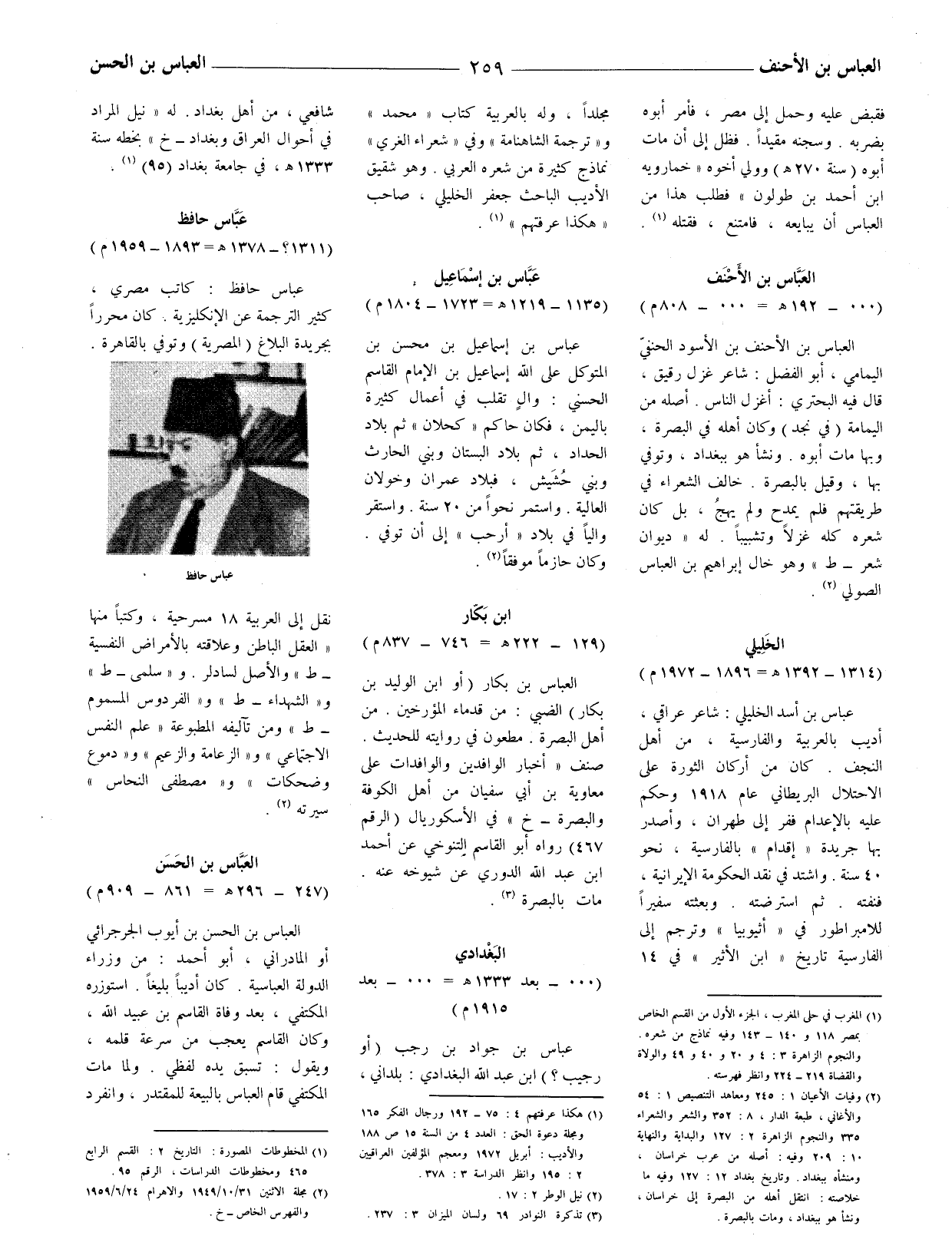 عباس بن أسد الخليلي: شاعر عراقي، أديب بالعربية والفارسية، من أهل النجف. كان من أركان الثورة على الاحتلال البريطاني عام 1918 وحكم عليه بالإعدام ففر إلى طهران، وأصدر بها جريدة (إقدام) بالفارسية، نحو 40 سنة واشتد في نقد الحكومة الإيرانية، فنفته. ثم استرضته.