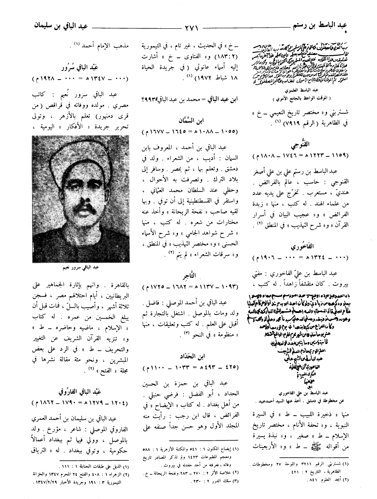 عبد الباقي بن سليمان بن أحمد العمري الفاروقي الموصلي: شاعر، مؤرخ. ولد بالموصل، وولي فيها ثم ببغداد أعمالا حكومية، وتوفي ببغداد. له (الترياق