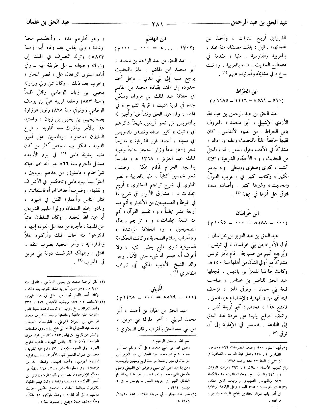 عبد الحق بن عبد الواحد بن محمد، أَبُو مُحَمَّد ابن الهاشم: عالم بالحديث يرجع نسبة إلى بني عديّ. دخل أحد جدوده إلى الهند بقيادة محمد بن القاسم في خلافة عبد الملك بن مروان وسكن جده في قرية سميت (قرية الشيوخ) في الهند، ولد عبد الحق ونشأ فيها وأجيز له بالتدريس من نحو أربعين شيخا ذكرهم في (ثبت) كبير صنفه وتصدر للتدريس في مدينة (أحمد فور الشرقية) مدرسا نحو (50) عاما وزار الحجاز حاجا وعينه الملك عبد العزيز (1368 هـ مدرسا