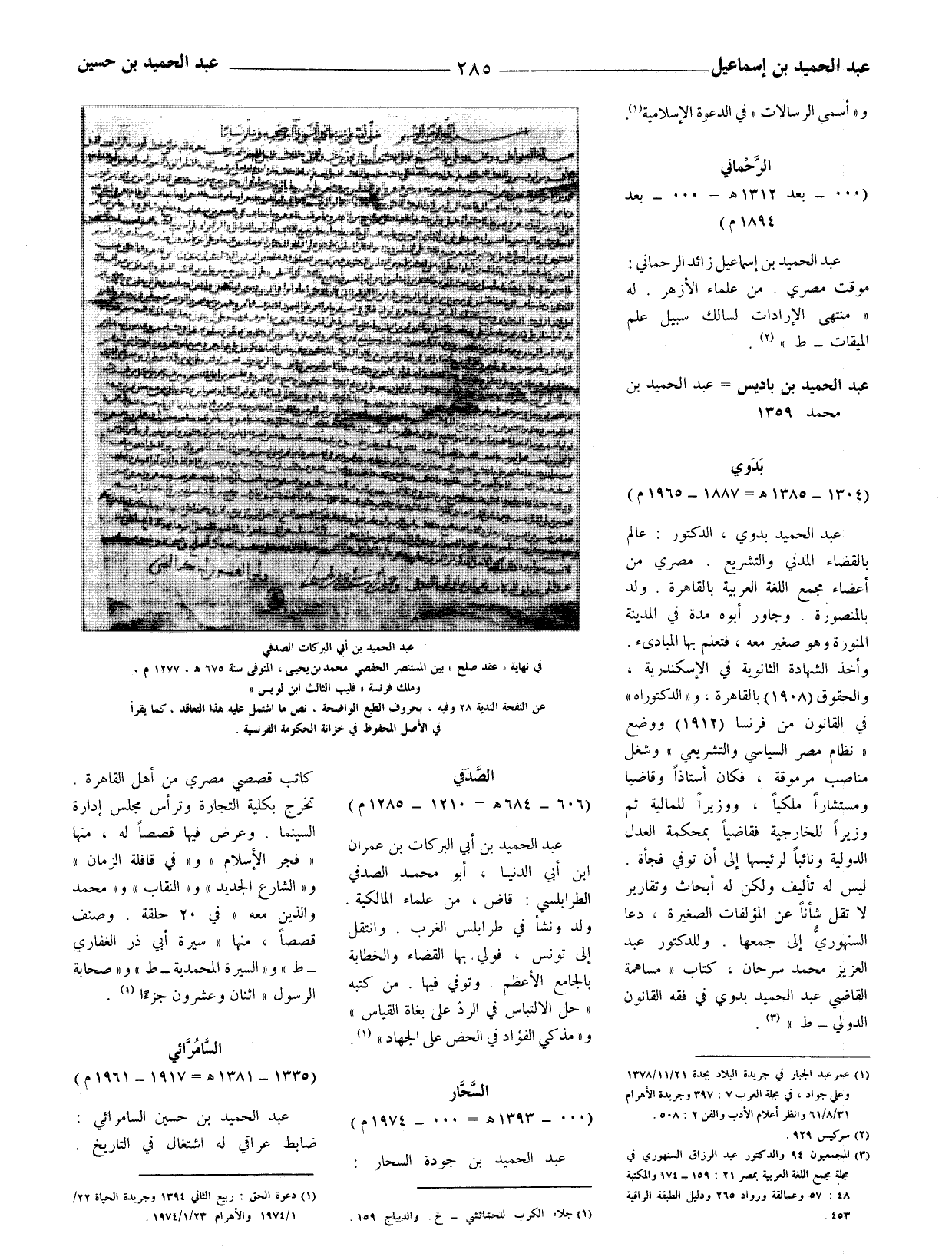(3) المجمعيون 94 والدكتور عبد الرزاق السنهوري في مجلة مجمع اللغة العربية بمصر 21: 159 - 174 والمكتبة 48: 57 وعمالقة ورواد 265 ودليل الطبقة الراقية 453.