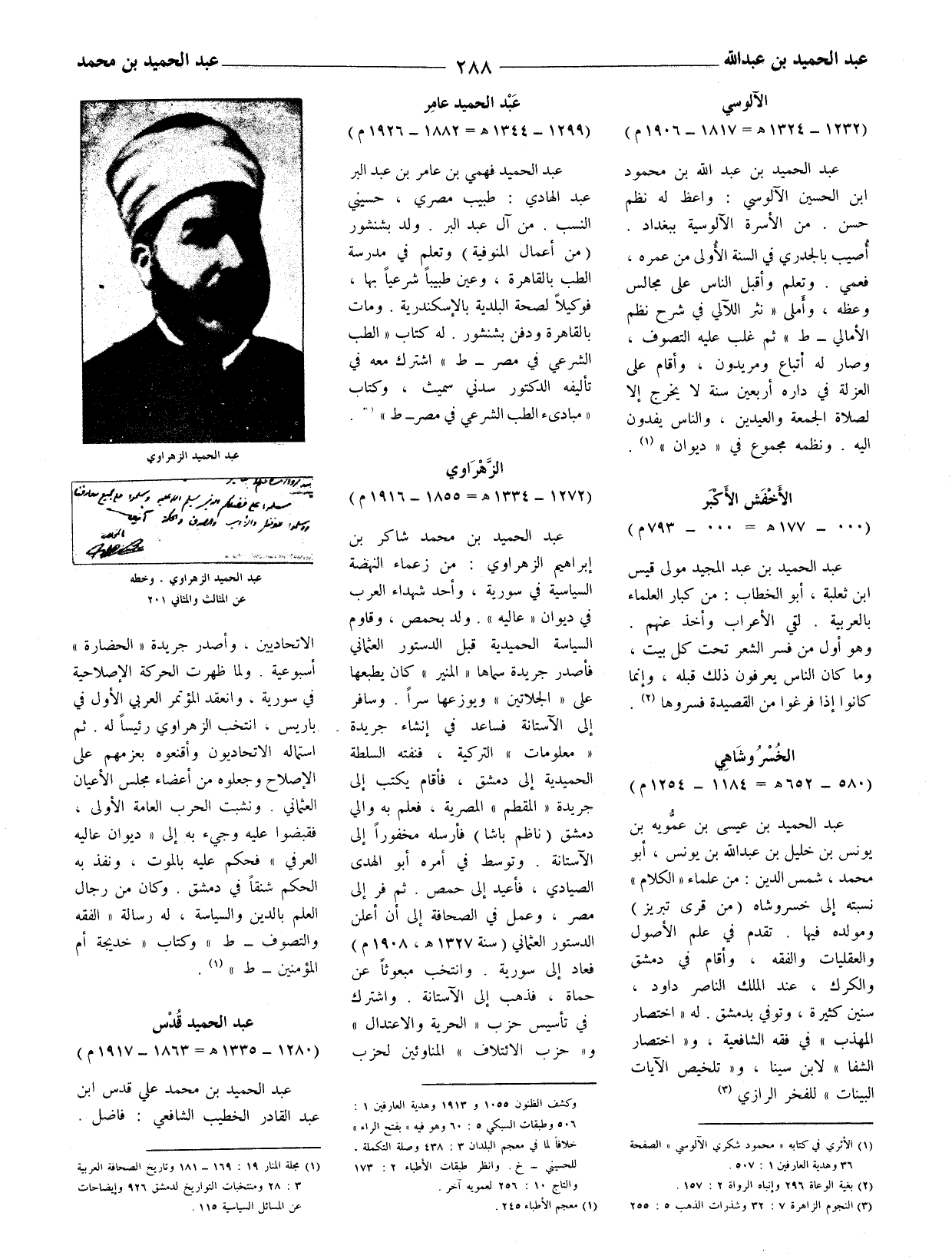عبد الحميد بن محمد شاكر بن إبراهيم الزهراوي: من زعماء النهضة السياسية في سورية، وأحد شهداء العرب في ديوان (عاليه) . ولد بحمص، وقاوم السياسة الحميدية قبل الدستور العثماني فأصدر جريدة سماها (المنير) كان يطبعها على (الجلاتين) ويوزعها سرا. وسافر الى الأستانة فساعد في إنشاء جريدة (معلومات) التركية، فنفته السلطة الحميدية إلى دمشق، فأقام يكتب إلى جريدة (المقطم) المصرية، فعلم به والي دمشق (ناظم باشا) فأرسله مخفورا إلى الآستانة.