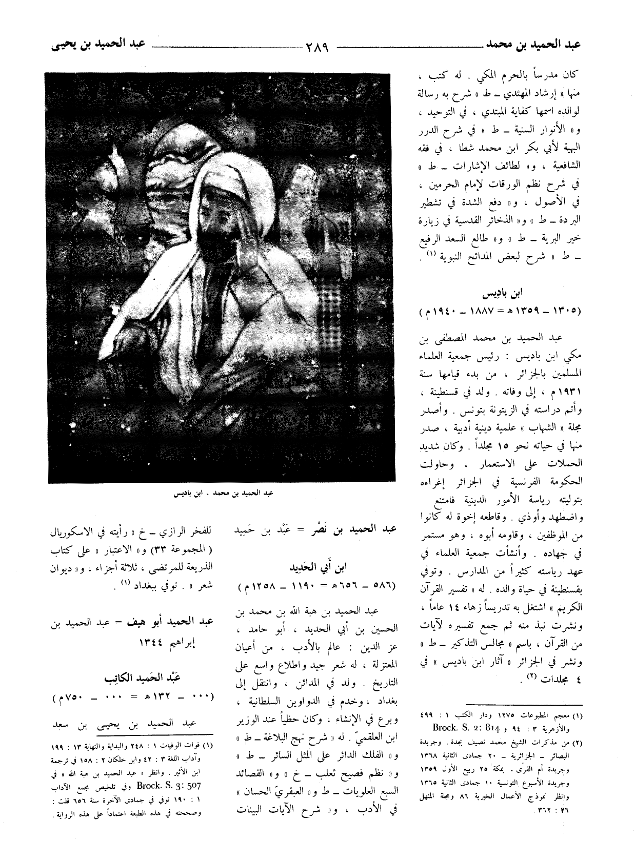 عبد الحميد بن محمد المصطفى بن مكي ابن باديس: رئيس جمعية العلماء المسلمين بالجزائر، من بدء قيامها سنة 1931 م، إلى وفاته. ولد في قسنطينة، وأتم دراسته في الزيتونة بتونس. وأصدر مجلة (الشهاب) علمية دينية أدبية، صدر منها في حياته نحو 15 مجلدا. وكان شديد الحملات على الاستعمار، وحاولت الحكومة الفرنسية في الجزائر إغراءه بتوليته رياسة الأمور الدينية فامتنع واضطهد وأوذي. وقاطعه إخوة له كانوا من الموظفين، وقاومه أبوه، وهو مستمر في جهاده. وأنشأت جمعية العلماء في عهد رياسته كثيرا من المدارس. وتوفي بقسنطينة في حياة والده. له (تفسير القرآن الكريم) اشتغل به تدريسا زهاء 14 عاما، ونشرت نبذ منه ثم جمع تفسيره لآيات من القرآن، باسم (مجلس التذكير - ط) ونشر في الجزائر (آثار ابن باديس) في 4 مجلدات (2) .