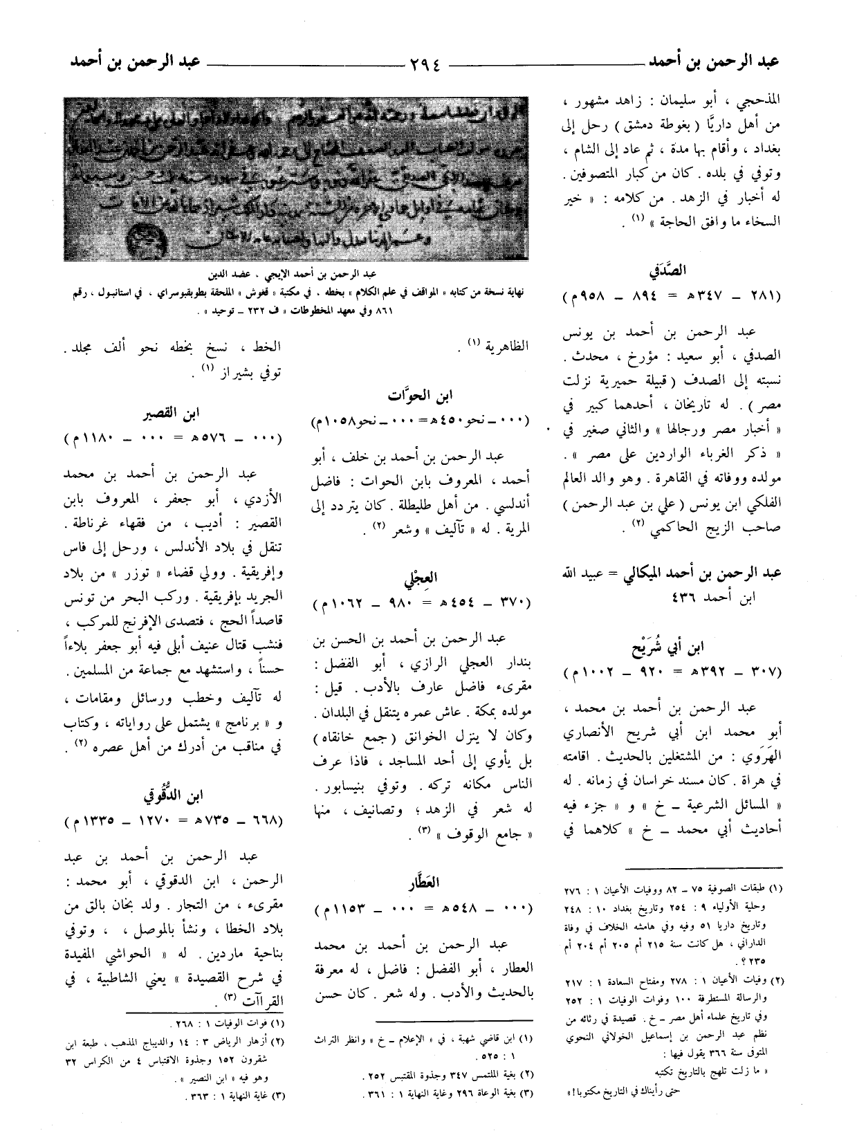 (2) وفيات الأعيان 1: 278 ومفتاح السعادة 1: 217 والرسالة المستطرفة 100 وفوات الوفيات 1: 252 وفي تاريخ علماء أهل مصر - خ. قصيدة في رثائه من نظم عبد الرحمن بن إسماعيل الخولانيّ النحويّ المتوفى سنة 366 يقول فيها: (ما زلت تلهج بالتأريخ تكتبه حتى رأيناك في التاريخ مكتوبا!)