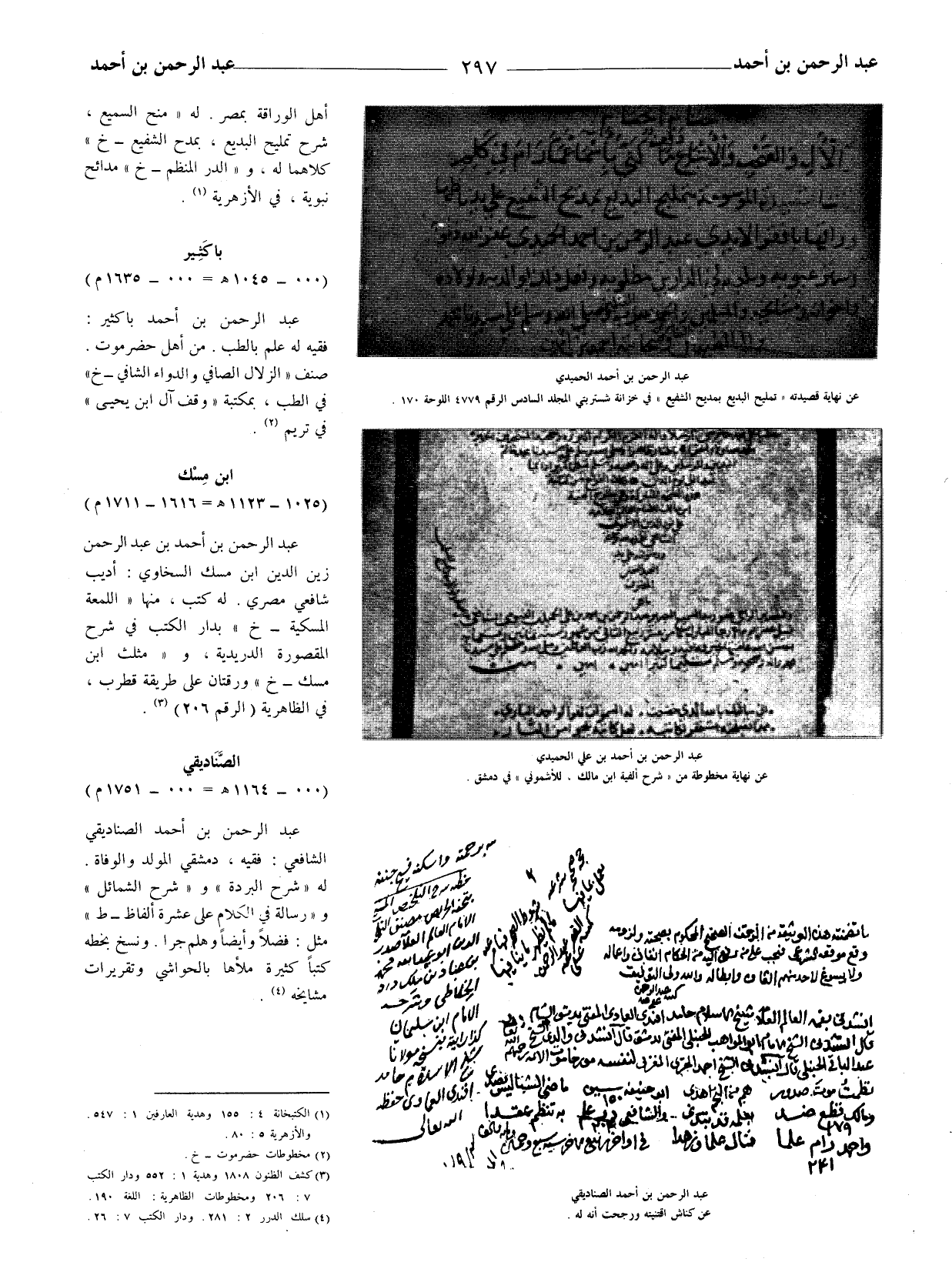 عبد الرحمن بن أحمد الصناديقي الشافعيّ: فقيه، دمشقي المولد والوفاة. له (شرح البردة) و (شرح الشمائل) و (رسالة في الكلام على عشرة ألفاظ - ط) مثل: فضلا وأيضا وهلم جرا.