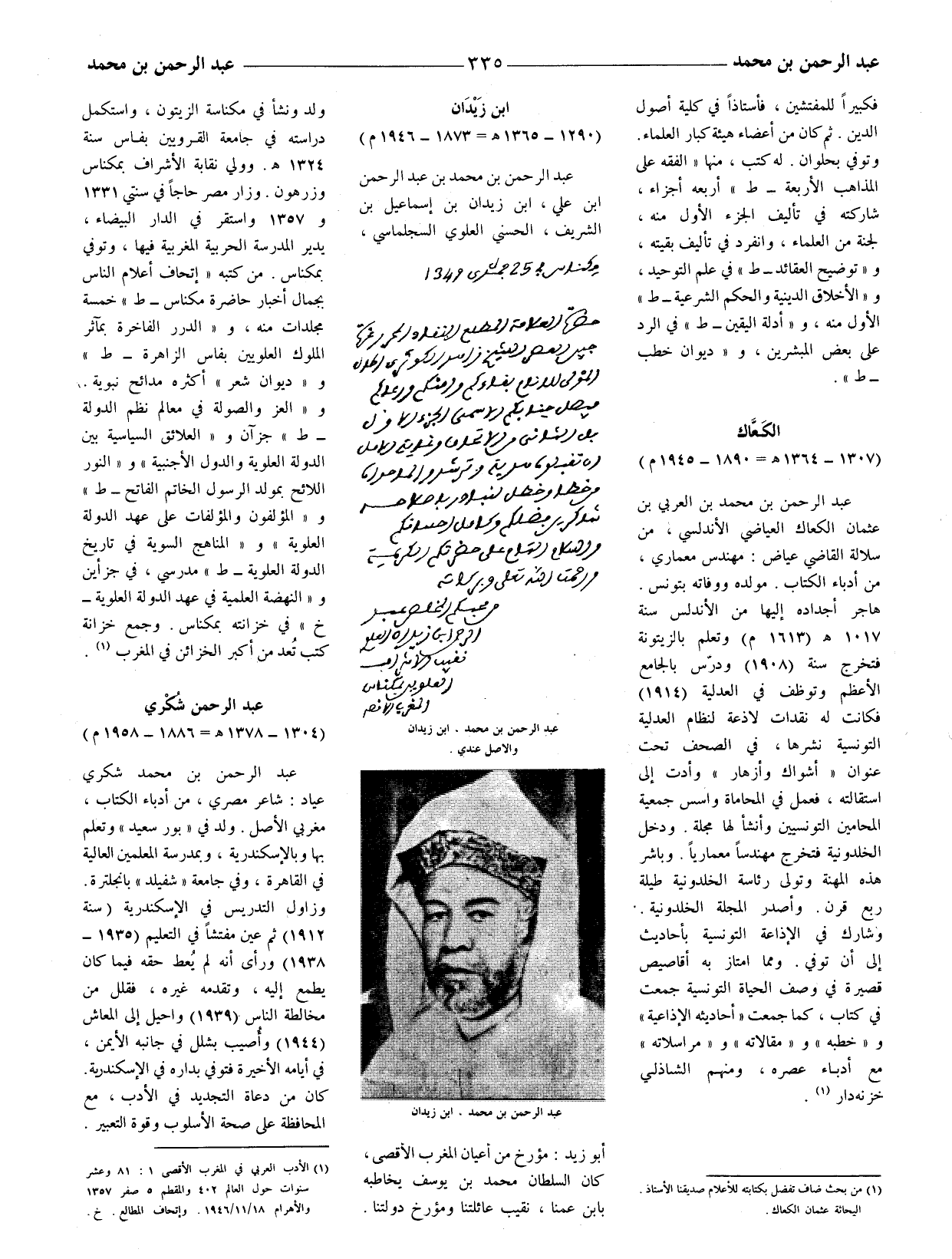 (1) الأدب العربيّ في المغرب الأقصى 1: 81 وعشر سنوات حول العالم 402 والمقطم 5 صفر 1357 والأهرام 18 / 11 / 1946. وإتحاف المطالع. خ.