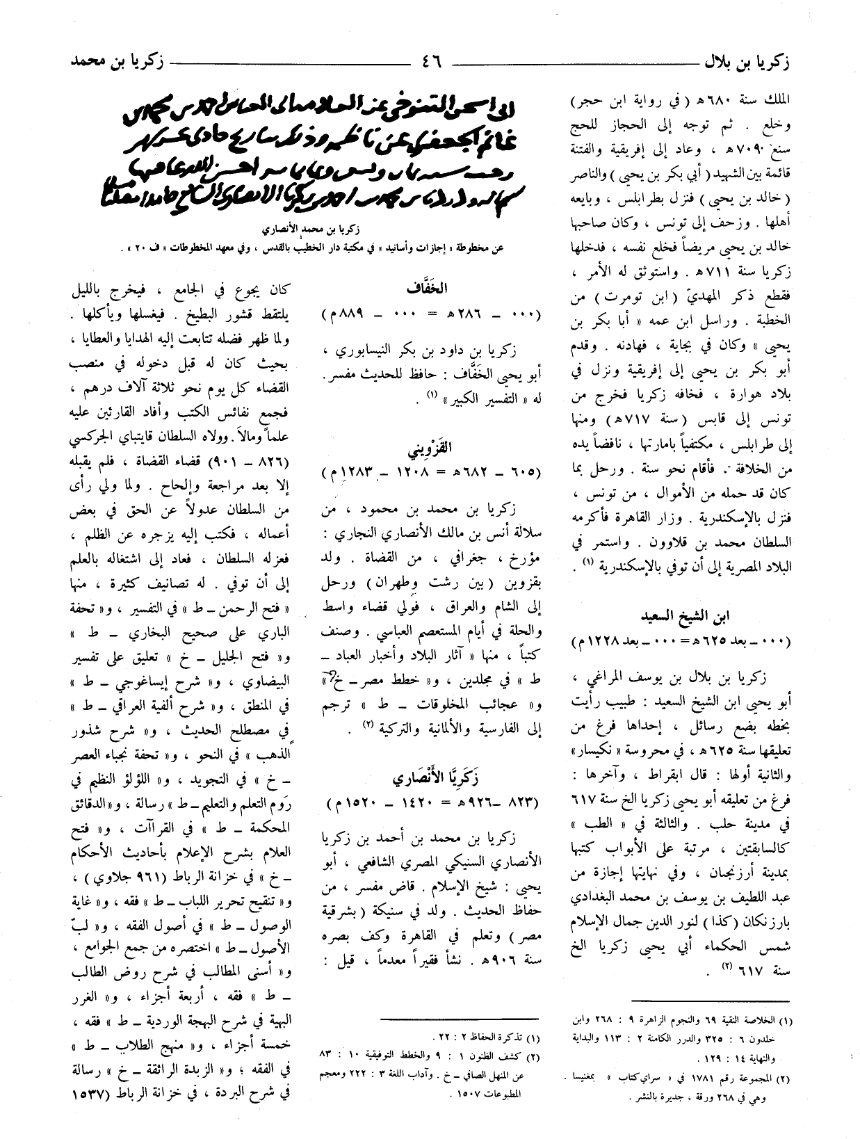 زكريا بن بلال بن يوسف المراغي، أبويحيى ابن الشيخ السعيد: طبيب رأيت بخطبه بضع رسائل، إحداها فرغ من تعليقها سنة 625 هـ في محروسة (نكيسار) والثانية أولها: قال ابقراط، وآخرها: فرغ من تعليقه أبويحيى زكريا إلخ سنة 617 في مدينة حلب. والثالثة في (الطب) كالسابقتين، مرتبة على الأبواب كتبها بمدينة أرزنجان، وفي نهايتها إجازة من عبد اللطيف بن يوسف بن محمد البغدادي بارزنكان (كذا) لنور الدين جمال الإسلام شمس الحكماء أبي يحيى زكريا إلخ سنة 617 (2) .