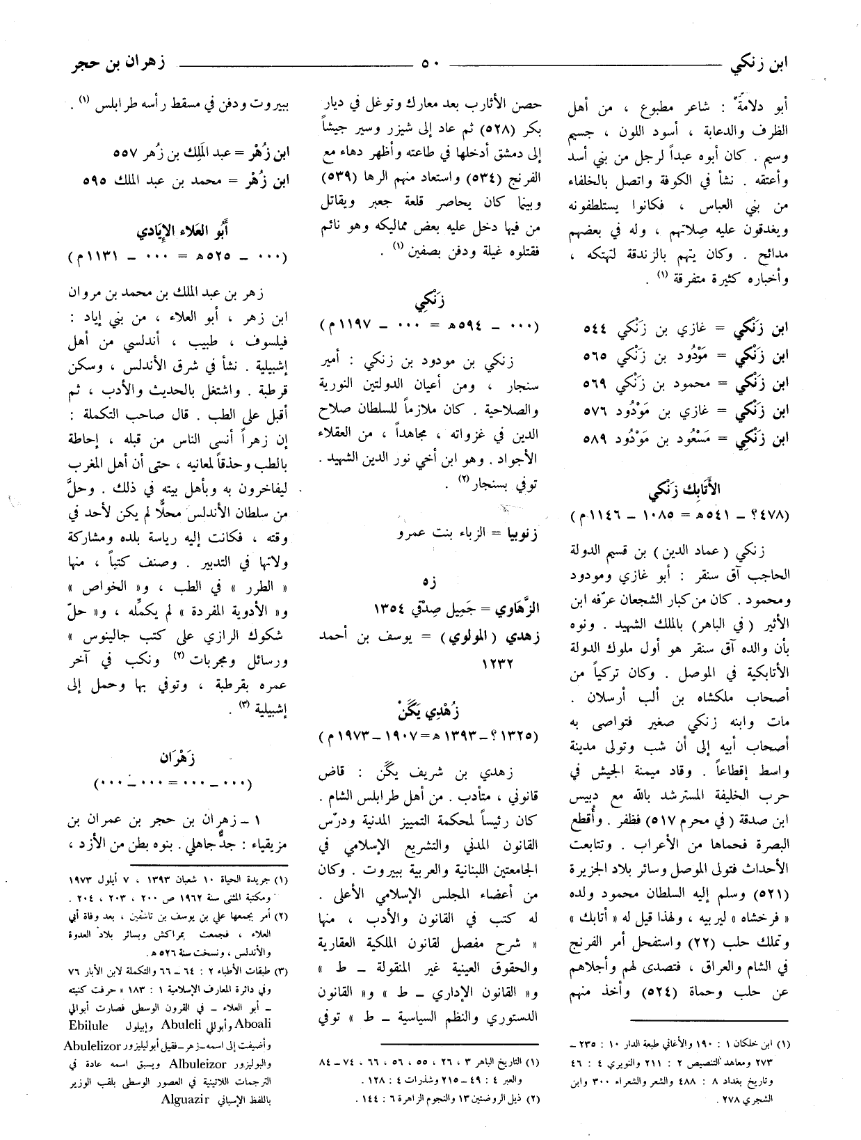 زنكي (عماد الدين) بن قسيم الدولة الحاجب آق سنقر: أبو غازي ومودود ومحمود. كان من كبار الشجعان عرّفه ابن الأثير (في الباهر) بالملك الشهيد. ونوه بأن والده آق سنقرهو أول ملوك الدولة الأتابكية في الموصل. وكان تركيا من أصحاب ملكشاه بن ألب أرسلان. مات وابنه زنكي صغير فتواصى به أصحاب أبيه إلى أن شب وتولى مدينة واسط إقطاعا. وقاد ميمنة الجيش في حرب الخليفة المسترشد باللَّه مع دبيس ابن صدقة (في محرم 517) فظفر. وأقطع البصرة فحماها من الأعراب. وتتابعت الأحداث فتولى الموصل وسائر بلاد الجزيرة (521) وسلم إليه السلطان محمود ولده (فرخشاه) ليربيه، ولهذا قيل له (أتابك) وتملك حلب (22) واستفحل أمر الفرنج في الشام والعراق، فتصدى لهم وأجلاهم عن حلب وحماة (524) وأخذ منهم