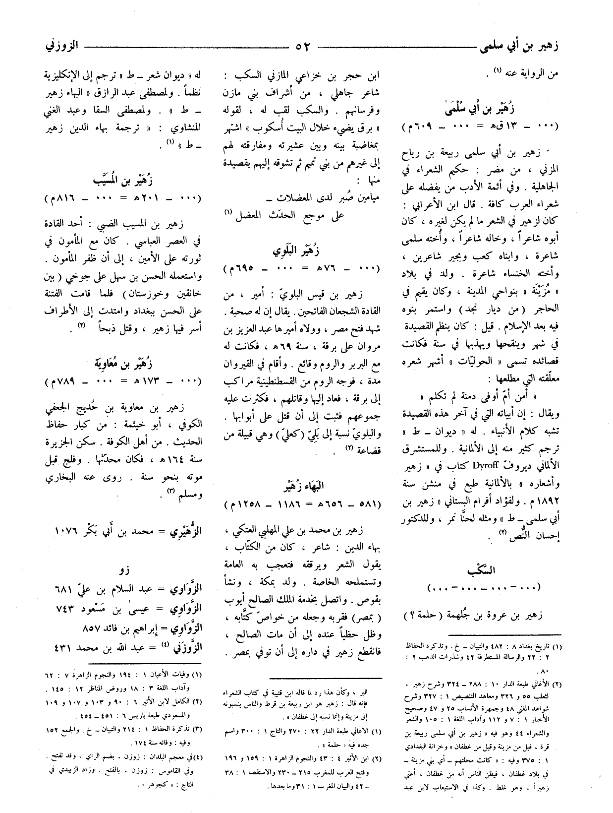 زهير بن أبي سلمى ربيعة بن رياح المزني، من مضر: حكيم الشعراء في الجاهلية. وفي أئمة الأدب من يفضله على شعراء العرب كافة. قال ابن الأعرابي: كان لزهير في الشعر ما لم يكن لغيره، كان أبوه شاعرا، وخاله شاعرا، وأخته سلمى شاعرة، وابناه كعب وبجير شاعرين، وأخته الخنساء شاعرة. ولد في بلاد (مٌزَينة) بنواحي المدينة، وكان يقيم في الحاجر (من ديار نجد) واستمر بنوه فيه بعد الإسلام. قيل: كان ينظم القصيدة في شهر وينقحها ويهذبها في سنة فكانت قصائده تسمى (الحوليّات) أشهر شعره معلقته التي مطلعها: (أمن أم أوفى دمنة لم تكلم) ويقال: إن أبياته التي في آخر هذه القصيدة تشبه كلام الأنبياء. له (ديوان - ط) ترجم كثير منه إلى الألمانية.