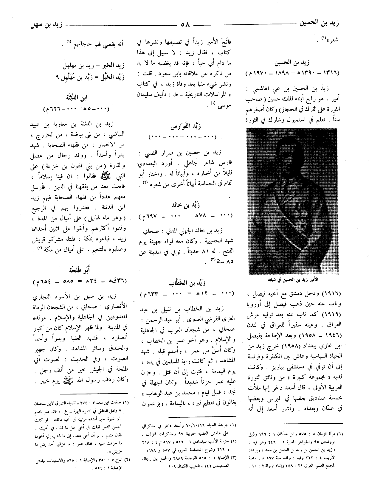زيد بن الحسين بن علي الهاشمي: أمير، هو رابع أبناء الملك حسين (صاحب الثورة على الترك في الحجاز) وكان أصغرهم سنا. تعلم في استمبول وشارك في الثورة (1916) ودخل دمشق مع أخيه فيصل، وناب عنه حين ذهب فيصل إلى أوروبا (1919) كما ناب عنه بعد توليه عرش العراق. وعينه سفيراللعراق في لندن (1946 - 1958) وبعد الإطاحة بفيصل ابن غازي ببغداد (1958) خرج زيد من الحياة السياسية وعاش بين انكلترة وفرنسة إلى أن توفي في مستشفى بباريز. وكانت لديه (مجموعة كبيرة) من وثائق الثورة العربية الأولى، قال أسعد داغر إنها ملأت خمسة صناديق بعضها في قبرس وبعضها في عمّان وبغداد. وأشار أسعد إلى أنه