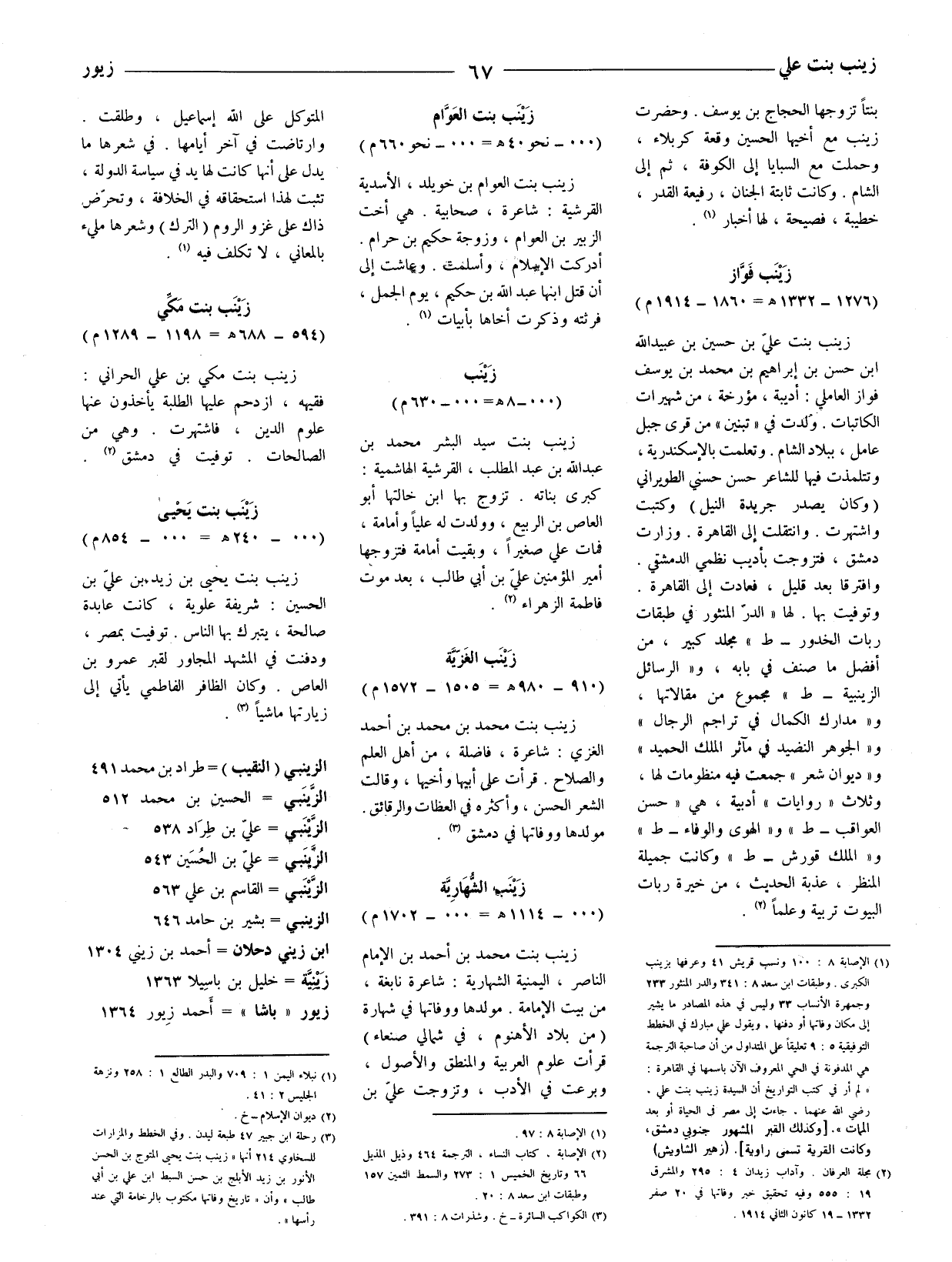 (1) الإصابة 8: 100 ونسب قريش 41 وعرفها بزينب الكبرى. وطبقات ابن سعد 8: 341 والدر المنثور 233 وجمهرة الأنساب 33 وليس في هذه المصادر ما يشير إلى مكان وفاتها أو دفنها، ويقول علي مبارك في الخطط التوفيقية 5: 9 تعليقا على المتداول من أن صاحبة الترجمة هي المدفونة في الحي المعروف الآن باسمها في القاهرة: (لم أر في كتب التواريخ أن السيدة زينت بنت علي، رضي الله عنهما، جاءت إلى مصر في الحياة أو بعد الممات) .