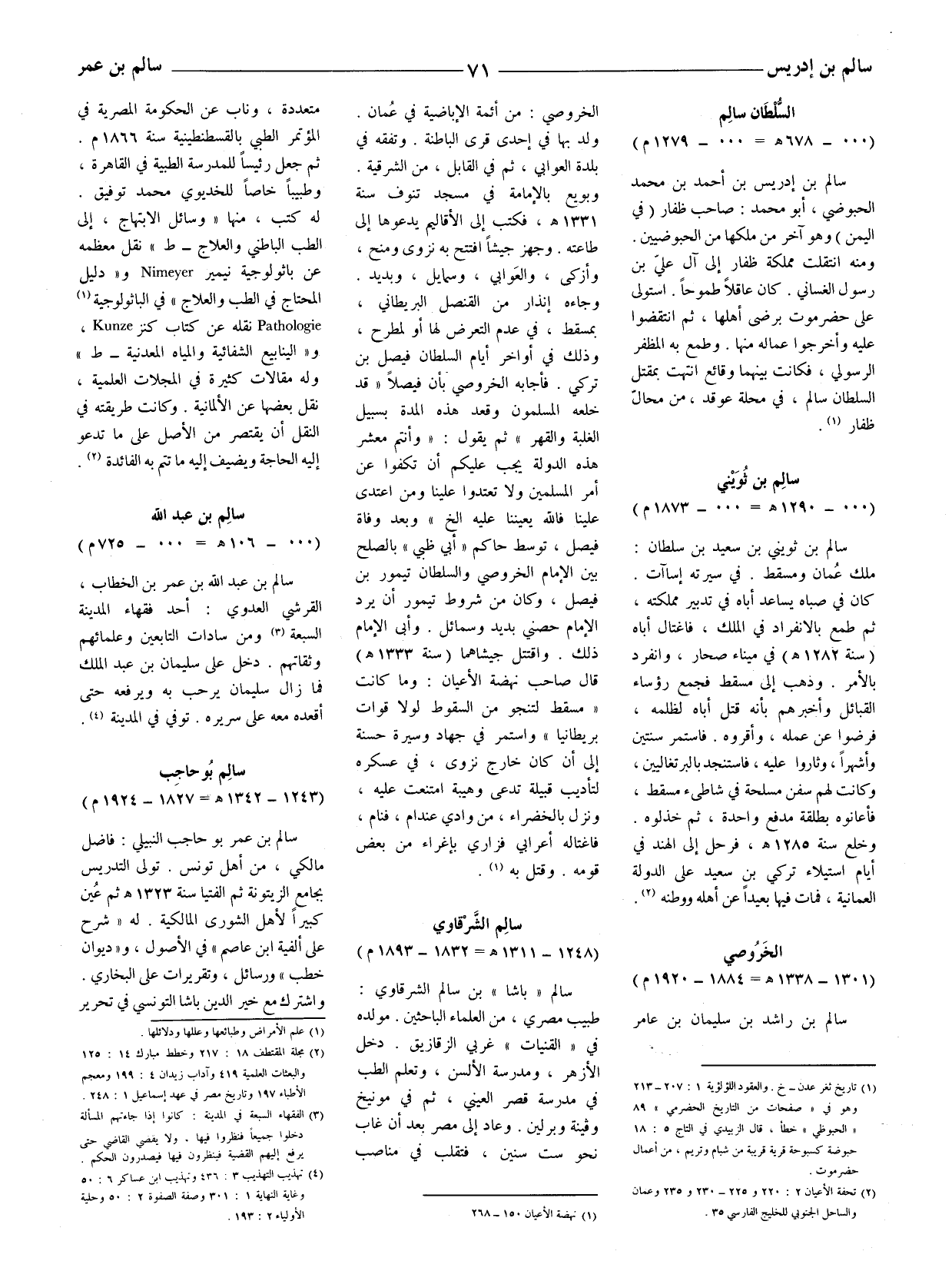 سالم بن ثويني بن سعيد بن سلطان: ملك عُمان ومسقط. في سيرته إساآت. كان في صباه يساعد أباه في تدبير مملكته، ثم طمع بالانفراد في الملك، فاغتال أباه (سنة 1282 هـ في ميناء صحار، وانفرد بالأمر. وذهب إلى مسقط فجمع رؤساء القبائل وأخبرهم بأنه قتل أباه لظلمه، فرضوا عن عمله، وأقروه. فاستمر سنتين وأشهرا، وثاروا عليه، فاستنجد بالبرتغاليين، وكانت لهم سفن مسلحة في شاطئ مسقط، فأعانوه بطلقة مدفع واحدة، ثم خذلوه. وخلع سنة 1285 هـ فرحل إلى الهند في أيام استيلاء تركي بن سعيد على الدولة العمانية، فمات فيها بعيدا عن أهله ووطنه (2) .