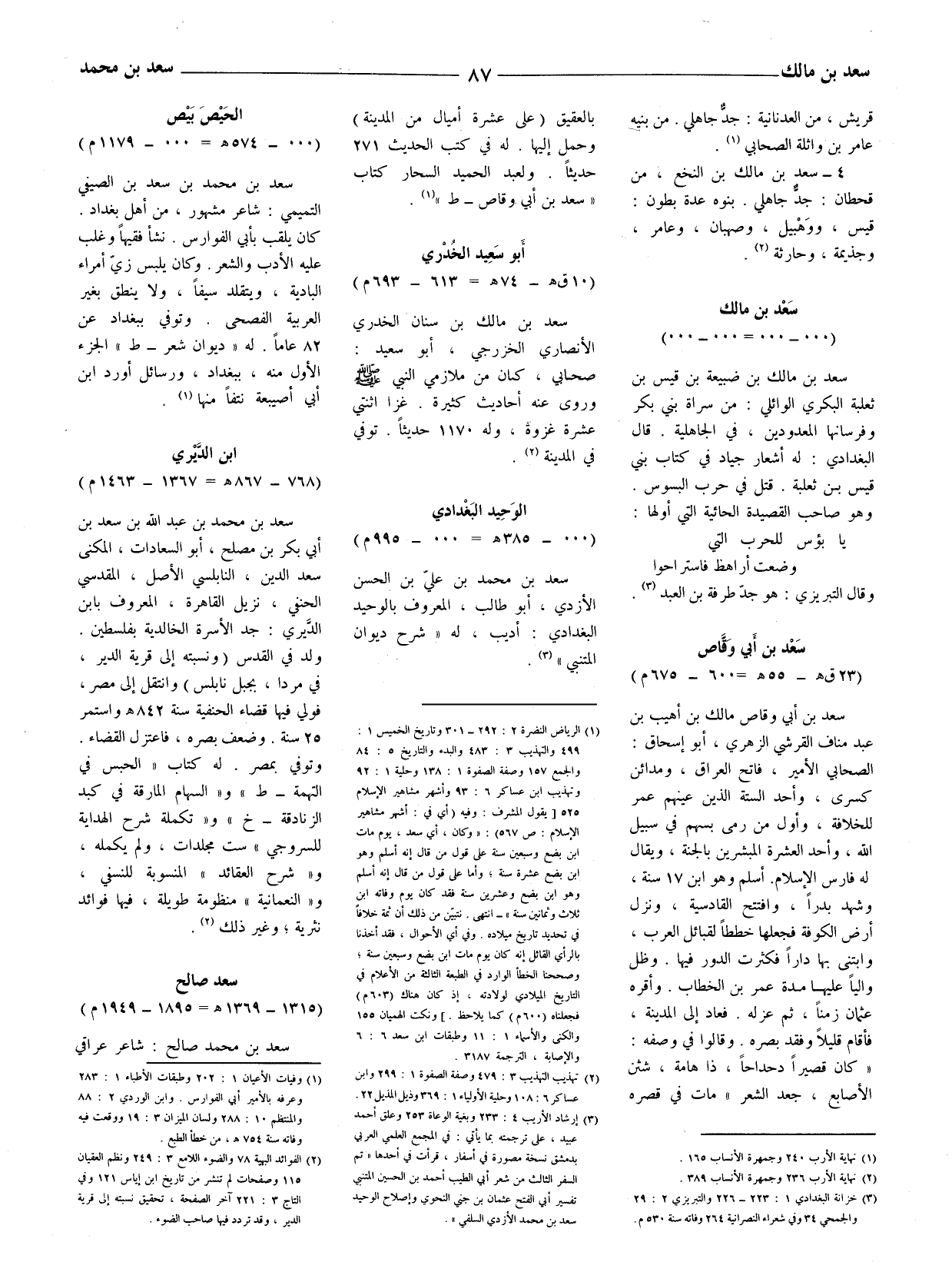 (1) الرياض النضرة 2: 292 - 301 وتاريخ الخميس 1:499 والتهذيب 3: 483 والبداء والتاريخ 5: 84 والجمع 157 وصفة الصفوة 1: 138 وحلية 1: 92 وتهذيب ابن عساكر 6: 93 وأشهر مشاهير الإسلام 525 [يقول المشرف: وفيه (أي في: أشهر مشاهير الإسلام: ص 567) : (وكان، أي سعد، يوم مات ابن بضع وسبعين سنة على قول من قال إنه أسلم وهو ابن بضع عشرة سنة، وأما على قول من قال إنه أسلم وهو ابن بضع وعشرين سنة فقد كان يوم وفاته ابن ثلاث وثمانين سنة) - انتهى. نتبيّن من ذلك أن ثمة خلافا في تحديد تاريخ ميلاده. وفي أي الأحوال، فقد اخذنا بالرأي القائل إنه كان يوم مات ابن بضع وسبعين سنة، وصححنا الخطأ الوارد في الطبعة الثالثة من الأعلام في التاريخ الميلادي لولادته، إذ كان هناك (603 م) فجعلناه (600 م) كما يلاحظ. ونكت الهميان 155 والكنى والاسماء 1: 11 وطبقات ابن سعد 6: 6 والاصابة، الترجمة 3187.