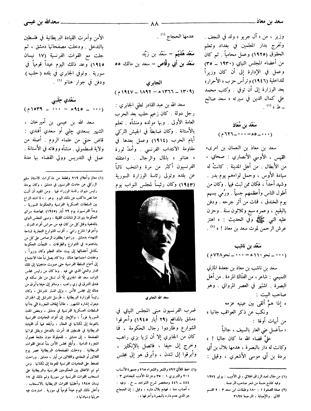 (1) معالم وأعلام 219 وقطعة من مذكرات الأستاذ سليم الزركلي عن حادث الفرنسيين في دمشق، وكان يومئذ رئيس ديوان رئاسة الوزراء فيها. ومن المفيد أن أثبت هنا نص ما كتب عن ذلك اليوم. وهو: (لما اشتد النزاع بين السلطات العسكرية الفرنسية والحكومة السورية، وبدأ الفرنسيون يوم 29 أيار (1945) بمهاجمة سراي الحكومة بنيران الرشاشات الثقيلة، ومبني المجلس الني أبي بالمدفعية وقتل كل من كان فيه من حراس أفراد الدرك. وأحرقوا شارع رامي، أقرب الشوارع التجارية لساحة الشهداء بدمشق. وراحوا يطلقون الرصاص على كل من يشاهدونه في الشوارع والطرقات، التجأت الحكومة بكامل أعضائها إلى بيت خالد العظم وكان وزيرا، وعقدت اجتماعها هناك. وما كاد يصل نبأ هذا الاجتماع إلى أسماع السلطة الفرنسية حتى صوبت مدفعيتها إلى تلك الدار والحي الذي هي فيه. وما كان من رئيس مجلس النواب سعد الله الجابري إلا أن تسلل من مقر سكنه في فندق الشرق في زي راهب، وسافر إلى حيفا وأبرق من هناك إلى مجلس الامن، وإلى المستر تشرشل، وكان رئيسا للوزارة البريطانية، فأرسل تشرشل إلى الجنرال ديغول إنذاره المشهور، طالبا إيقاف المجزرة التي بدأتها السلطات العسكرية الفرنسية في دمشق، وبعض المدن السورية فورا، والايعاز إلى أفراد الحاميات الفرنسية بالعودة إلى ثكناتها في الحال، وأبلغه فيها أن القيادة البريطانية في فلسطين قد أمرت بالتدخل وبنقل قواتها المصفحة، إلى دمشق، للحيلولة دون متابعة فصول المجزرة الدامية. وأبلغ مجلس الامن بنبأ تدخل القوات البريطانية. ودخلت المصفحات البريطانية عصر يوم الثلاثين أو الحادي والثلاثين من أيار، دمشق. وراحت تضغط على الحاميات الفرنسية للعودة إلى ثكناتها. ومن ثم تم الاتفاق بين الحكومتين الفرنسية والبريطانية على انسحاب القوات الفرنسية من سورية وتم ذلك في 17 نيسان 1945 وأعقبتها القوات البريطانية بالانسحاب. وأعلن ذلك اليوم عيدا قوميا في سورية.