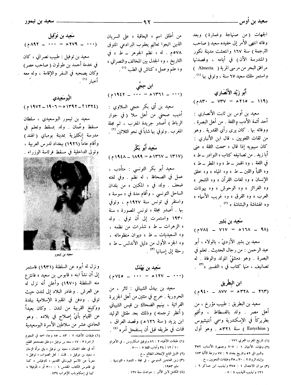 سعيد بن تيمور البوسعيدي، سلطان مسقط وعمان. ولد بمسقط وتعلم في مدرسة إنكليزية بمدينة بومباي (الهند) وأقام عاما (1926) ببغداد لدرس العربية، وتولى الداخلية في مسقط فرئاسة الوزراء. ونزل له أبوه عن السلطنة (1931) فاستمر الى أن نشأ ابنه (قابوس بن سعيد) فانتزع منه السلطنة (1970) وأعلن أنه نزل له عن العرش. وغادر البلاد إلى لندن حيث توفي. ودفن في المقبرة الاسلامة ببلدة ووكينغ القريبة من لندن. وكان بعيدا عن القيام بأيّ إصلاح في بلاده. وهو الحادي عشر من سلاطين الأسرة البوسعيدية