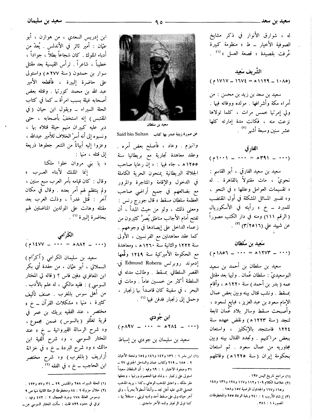 (1) ابن بشر 1: 136 و 142 و 146 و 154 وتحفة الأعيان 2: 185 - 219 وكتاب عمان والساحل الجنوبي 27 -31وصفوة الاعتبار 1: 69 وفيه: أن السلطان سعيدا استولى على زنجبار، وشاد فيها الحصون ورتبها، وجعلها مقر ملكه، واعتنق المذهب الوه أبي - كذا، يريد المذهب الحنبلي الّذي عليه أهل نجد - وأنشأ أسطولا بحريا، وفي آخر حياته ولى على مسقط أحد ولديه ثويني، مستقلا بها، كما تولى الزنجبار ولده الآخر ماجدي.